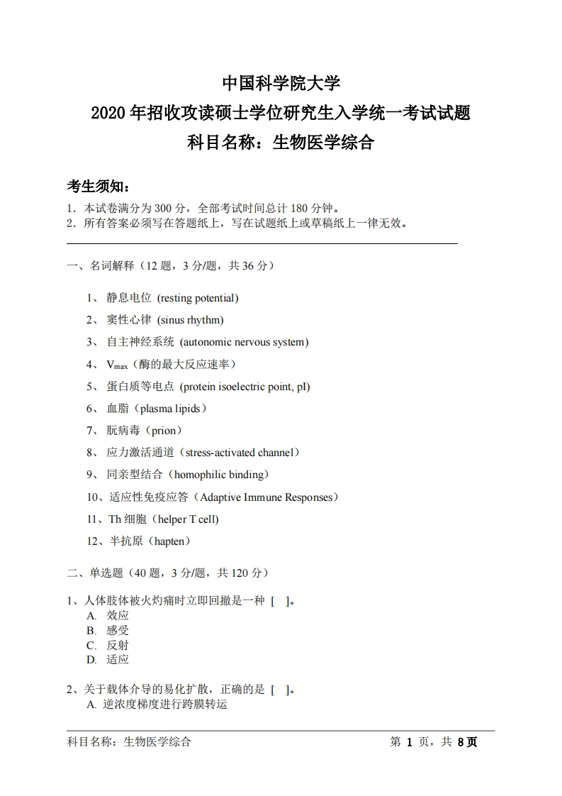 中国科学院大学2020年招收攻读硕士学位研究生入学统一考试试题科目名称:生物医学综合考生须知:1.本试卷满分为300分,全部考试时间总计180分钟。2.所有答案必须写在答题纸上,写在试题纸上或草稿纸上一律无效。一、名词解释(12题,3分/题,共36分)l、静息电位(resting potential)2、窦性心律(sinus rhythm)3、自主神经系统(autonomic nervous system)4、Vmax(酶的最大反应速率)5、蛋白质等电点(protein isoelectric point,pl)6、血脂(plasma lipids)7、朊病毒(prion)8、应力激活通道(stress-activated channel)9、同亲型结合(homophilic binding)l0、适应性免疫应答(Adaptive Immune Responses)ll、Th细胞(helper T cell)12、半抗原(hapten)二、单选题(40题,3分/题,共120分)1、人体肢体被火灼痛时立即回撤是一种[]。A.效应B.感受C.反射D.适应2、关于载体介导的易化扩散,正确的是[]。A.逆浓度梯度进行跨膜转运科目名称:生物医学综合第1页,共8页