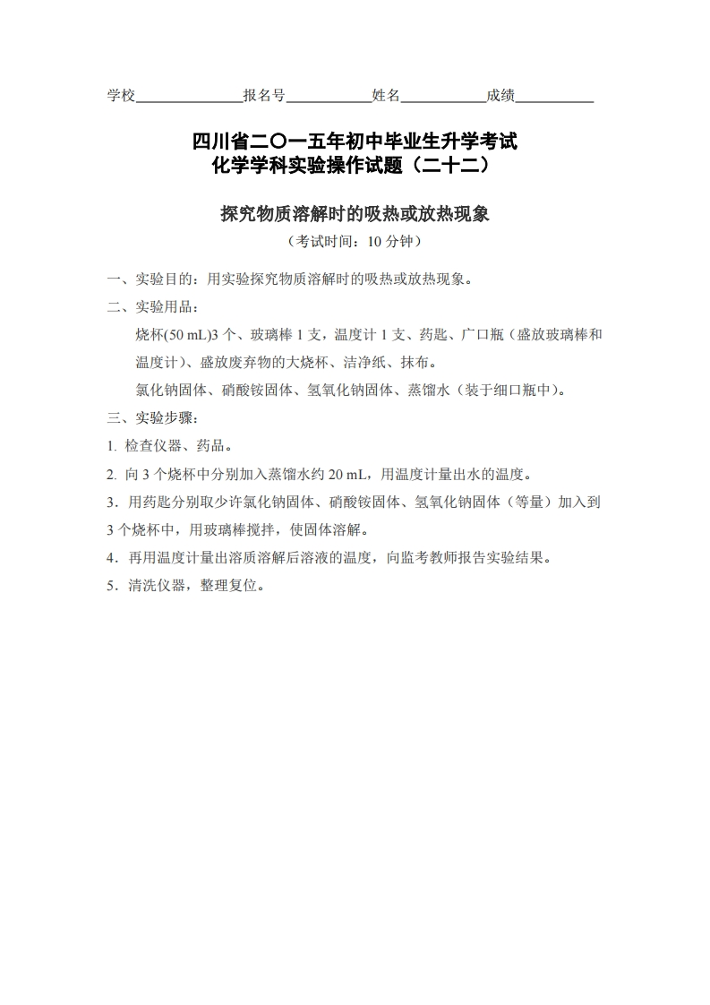 学校报名号姓名成绩四川省二O一五年初中毕业生升学考试化学学科实验操作试题(二十二)探究物质溶解时的吸热或放热现象(考试时间:10分钟)一、实验目的:用实验探究物质溶解时的吸热或放热现象。二、实验用品:烧杯(50L)3个、玻璃棒1支,温度计1支、药匙、广口瓶(盛放玻璃棒和温度计)、盛放废弃物的大烧杯、洁净纸、抹布。氯化钠固体、硝酸铵固体、氢氧化钠固体、蒸馏水(装于细口瓶中)。三、实验步骤:1.检查仪器、药品。2.向3个烧杯中分别加入蒸馏水约20L,用温度计量出水的温度。3.用药匙分别取少许氯化钠固体、硝酸铵固体、氢氧化钠固体(等量)加入到3个烧杯中,用玻璃棒搅拌,使固体溶解。4.再用温度计量出溶质溶解后溶液的温度,向监考教师报告实验结果。5.清洗仪器,整理复位。