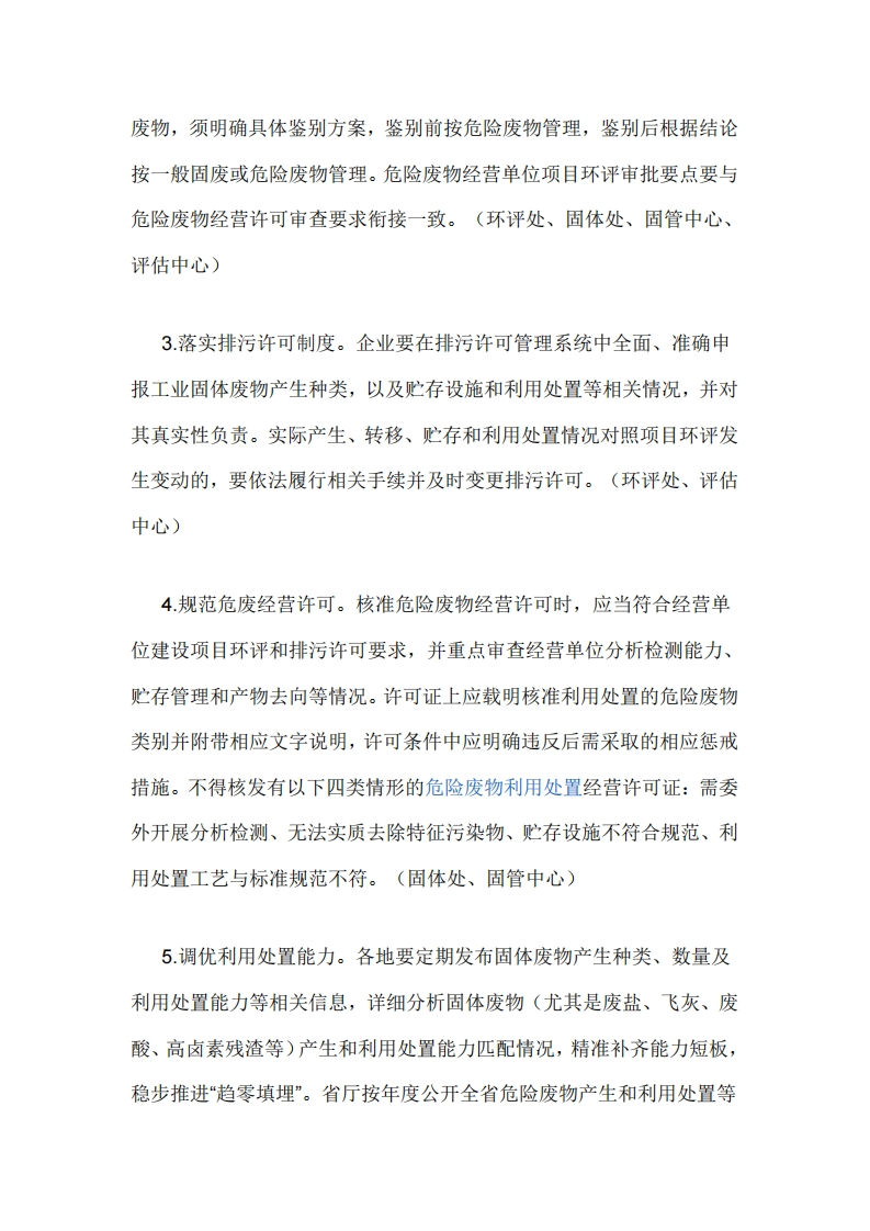 江苏省固体废物全过程环境监管工作意见(征求意见稿)为深入贯彻落实全国、全省生态环境保护大会精神,全面加强我省固体废物污染防治,完善“源头严防、过程严控、末端严管”的全过程监管体系,切实防范系统性环境风险,现就加强固体废物全过程环境监管提出如下工作意见。一、注重源头预防1.落实规划环评要求。规划环评要对本区域内固体废物产生种类、数量及其利用处置方式进行详细分析阐述,明确源头减量总体目标、具体措施,以及补齐区域利用处置能力短板的具体建设项目,力争实现区域内固体废物就近利用处置。(环评处、固体处、固管中心、评估中心)2.规范项目环评审批。建设项目环评要评价产生的固体废物种类、数量、来源和属性,论述贮存、转移和利用处置方式合规性、合理性,提出切实可行的污染防治对策措施。所有产物要按照以下五类属性给予明确并规范表述:目标产物(产品、副产品)、鉴别属于产品(符合国家、行业或地方标准)、可定向用于特定用途按产品管理(如符合团体标准)、一般固体废物和危险废物。不得出现“中间产物”“再生产物”等不规范表述,严禁以“副产品”名义逃避监管。不能排除危险特性的固体