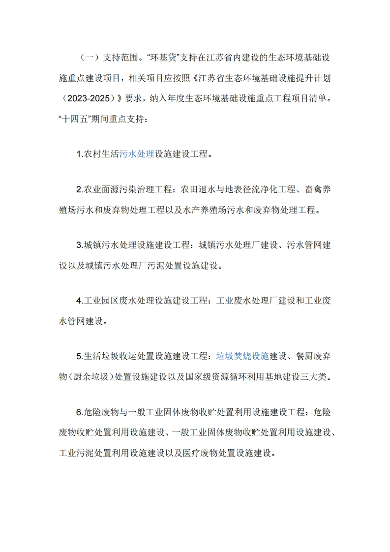 各设区市生态环境局、财政局,各有关金融机构:为充分发挥财政政策及金融工具协同作用,全面助推生态环境基础设施建设,在全省范围内创新实施“环基贷”政策,现将《江苏省“环基贷”工作实施方案》印发你们,请认真组织实施。江苏省生态环境厅江苏省财政厅国家开发银行江苏省分行2023年12月22日江苏省“环基贷”工作实施方案为全面推进江苏省生态环境基础设施建设,更好地发挥财政政策及金融工具协同作用,明确“环基贷”实施和财政贴息政策要求,推动形成财政重点关注、金融优先支持、社会积极参与的多元投入格局,制定本方案。一、财政金融政策保障省生态环境厅、省财政厅与合作银行共同推出“环基贷”金融服务产品,为全省生态环境基础设施项目建设提供低门槛、低成本、长期限、大额度信贷支持。国家开发银行江苏省分行作为重要合作银行,“十四五”期间计划为我省生态环境基础设施建设提供500亿元“环基贷”支持。