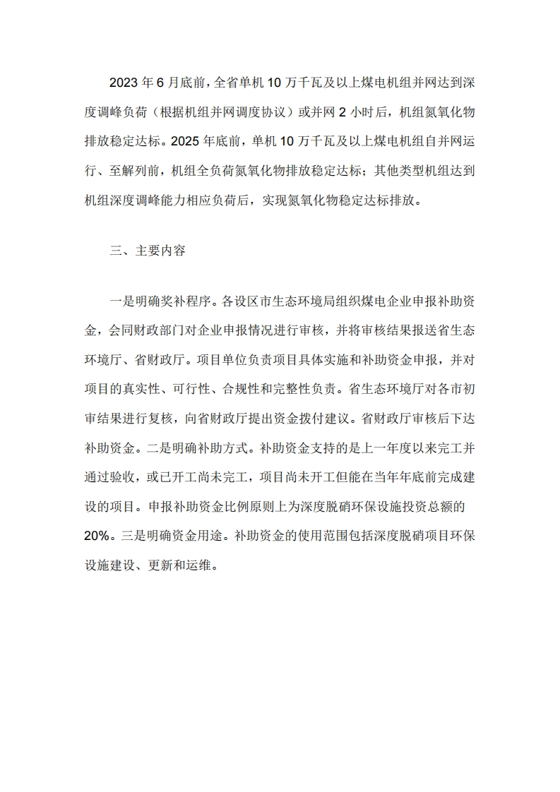 一、政策背景自2014年实施节能减排升级与改造专项行动以来,全省燃煤发电企业积极响应超低排放要求,有序推进环保设施改造提升。截至2020年底,全省在役煤电机组均已全部完成大气污染物超低排放改造,实现了电力供应有效保障和主要污染物排放大幅削减的预期目标,有力支撑了“十三五”期间全省环境空气质量改善和经济社会健康发展。随着我省风电、光伏等可再生能源装机以及区外来电占比不断增加,煤电机组深度调峰、启停调峰压力进一步加大,对机组环保设施特别是脱硝设施稳定运行提出了新的要求。进入“十四五”期间,我省火电企业启停炉排放问题突出,据统计,今年,启停最频繁的1至4月份,全省机组启停558次,影响时间超过3900小时。启炉阶段氮氧化物排放普遍超标(平均浓度318毫克/立方米),是超低标准(50毫克/立方米)6.4倍,是我省电厂平均排放浓度(30.5毫克/立方米)10.4倍,对周边国控站点乃至城市空气质量影响显著。因此,深入推进火电等重点行业深度减排是切实降低我省大气污染物排放强度、实现大气环境质量持续改善的重要举措。二、目标任务