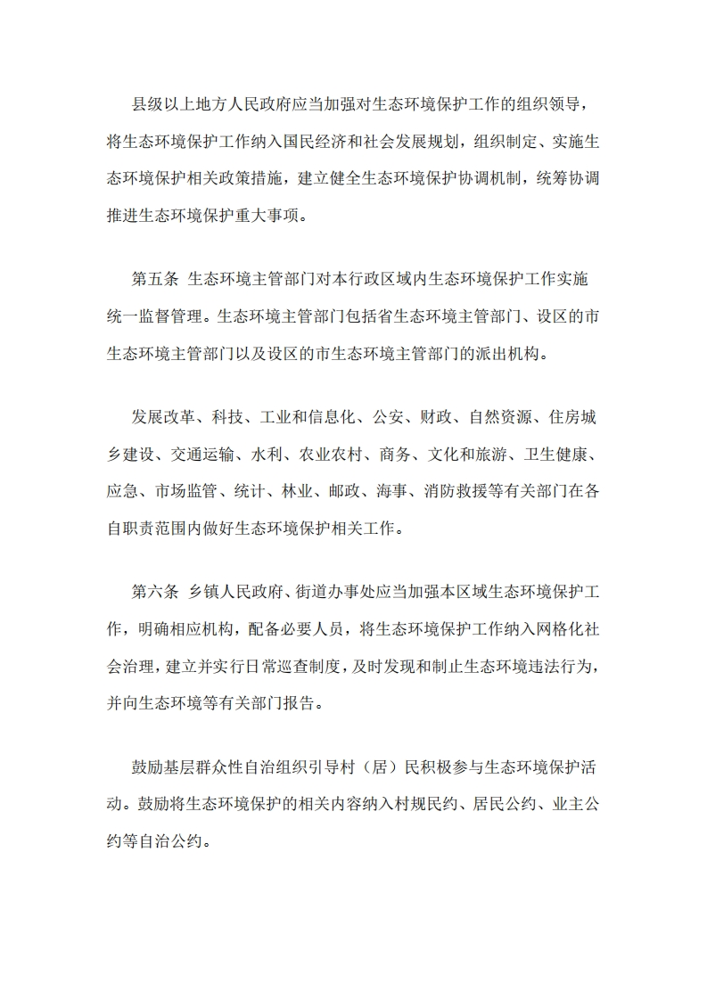 江苏省生态环境保护条例(草案)(征求意见稿)第一章总则第一条为了保护和改善生态环境,防治污染和其他公害,保障公众健康,加强生态文明建设,协同推进高质量发展和高水平保护,加快建设人与自然和谐共生的美丽江苏,根据《中华人民共和国环境保护法》等法律、行政法规,结合本省实际,制定本条例。第二条本省行政区域内生态环境保护及其监督管理活动,适用本条例。第三条生态环境保护工作应当坚持中国共产党的领导,坚持以习近平生态文明思想为指导,坚持绿水青山就是金山银山的理念,坚持山水林田湖草沙一体化保护,遵循节约和保护优先、预防为主、综合治理、公众参与、损害担责的原则。第四条地方各级人民政府对本行政区域的生态环境质量负责,应当加大生态环境保护的财政投入,提升生态环境基础设施水平。