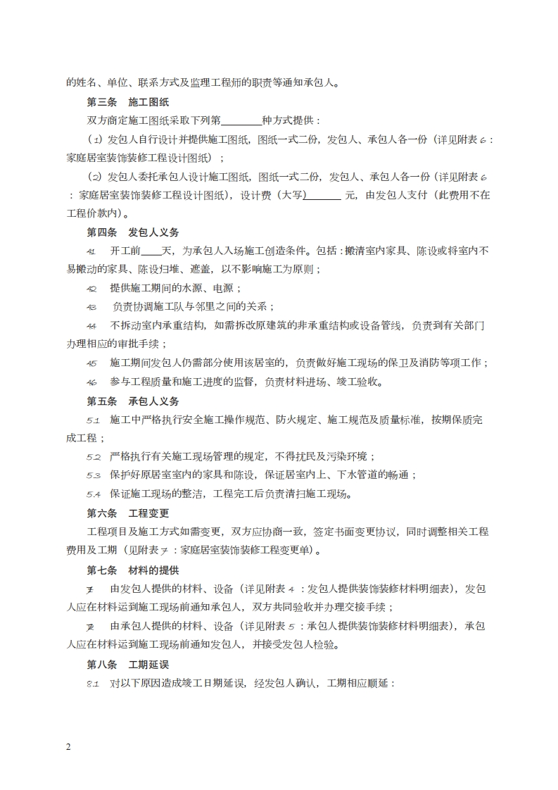 GF-2000-0207家庭居室装饰装修工程施工合同(示范文本)合同编号发包人:承包人:住所:住所:委托代理人:营业执照号:电话:法定代表人:电话:飞P机号:委托代理人:电话:本工程设计人:电话:施工队负责人:电话:依照《中华人民共和国合同法》及有关法律、法规的规定,结合家庭居室装饰装修工程施工的特点,双方在平等、自愿、协商一致的基础上,就发包人的家庭居室装饰装修工程(以下简称工程)的有关事宜,达成如下协议:第一条工程概况11工程地点:1.2工程内容及做法(详见附表1:家庭居室装饰装修工程施工项目确认表。附表2:家庭据室装饰装修工程内容和做法一览表)。1.3工程承包方式:双方商定采取下列第种承包方式。(1)承包人包工、包料(详见附表5:承包人提供装饰装修材料明细表);(2)承包人包工、部分包料,发包人提供部分材料(详见附表4:发包人提供装饰装修材料明细表。附表5:承包人提供装饰装修材料明细表);()承包人包工、发包人包料(详见附表4:发包人提供装饰装修材料明细表)。1.4工程期限天,开工日期年一月日,竣工日期年一月一日。1.5合同价款:本合同工程造价为(大写):元(详见附表3:家庭居室装饰装修工程报价单)。第二条工程监理若本工程实行工程监理,发包人与监理公司另行签订《工程监理合同》,并将监理工程师1