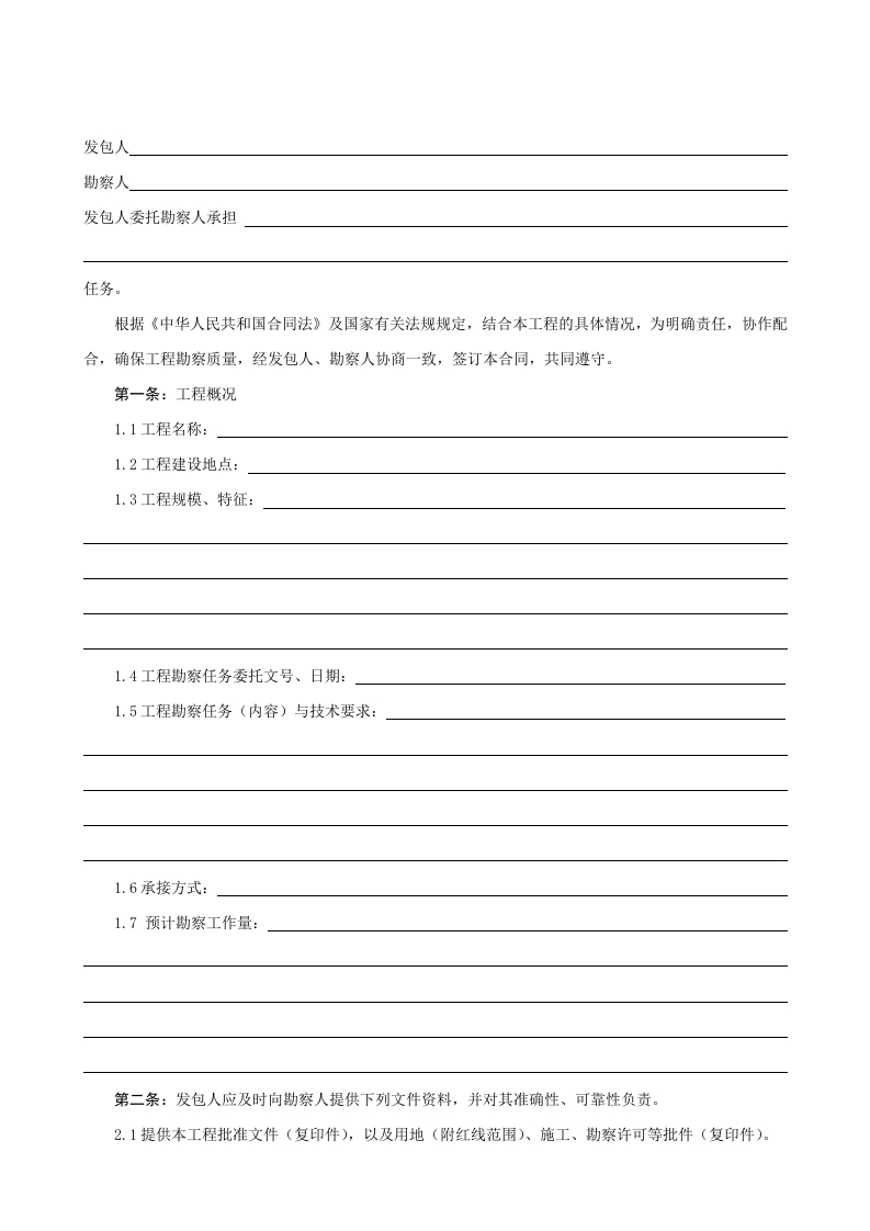 建设工程勘察合同(一)(示范文本)〔岩土工程勘察、水文地质勘察(含凿井)工程测量、工程物探〕348072@abc2个月前发布关注私信53KB6页0328建设工程勘察合同(一)(示范文本)〔岩土工程勘察、水文地质勘察(含凿井)工程测量、工程物探〕此内容为付费资源,请付费后查看¥16¥19黄金会员免费钻石会员免费立即购买您当前未登录!建议登陆后购买,可保存购买订单付费资源 第1页 / 共6页 第2页 / 共6页 试读已结束,还剩4页,您可下载完整版后进行离线阅读 © 版权声明文章版权归作者所有,未经允许请勿转载。THE ENDPPT模板 文本预览 GF-20000203建设工程勘察合同(一)(示范文本)〔岩土工程勘察、水文地质勘察(含凿井)工程测量、工程物探]工程名称:工程地,点合同编号:(由勘察人编填)勘察证书等级:发包人:勘察人签订日期:中华人民共和国建设部制定国家工商行政管理总局二○○○年三月 查看更多 收起部分 喜欢就支持一下吧点赞8 分享QQ空间微博QQ好友海报分享复制链接收藏