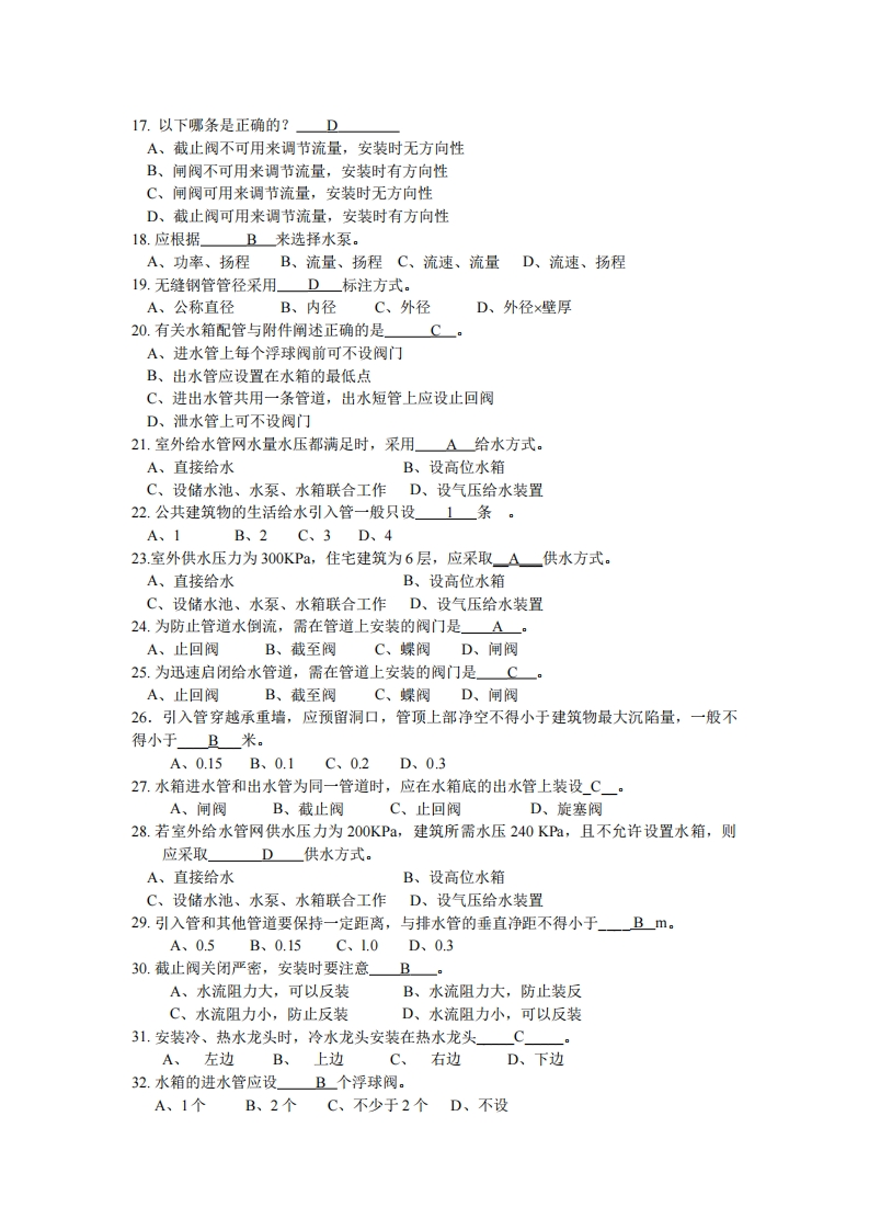 建筑设备考试题库-单项选择题1.以下水箱接管上不设阀门的是C。A、进水管B、出水管C、溢流管D、泄水管2.镀锌钢管规格有DN15、DN20等,DN表示B。A、内径B、公称直径C、外径D、其他3.不能使用焊接的管材是。DA、塑料管B、无缝钢管C、铜管D、镀锌钢管4.竖向分区的高层建筑生活给水系统中,最低卫生器具配水点处的静水压力不宜大于A MPa.A、0.45B、0.5C、0.55D、0.65.室外给水管网水压周期性满足室内管网的水量、水压要求时,采用B给水方式。A、直接给水B、设高位水箱C、设储水池、水泵、水箱联合工作D、设气压给水装置6.设高位水箱给水时,为防止水箱的水回流至室外管网,在进入室内的引入管设置AA、止回阀B、截至阀C、蝶阀D、闸阀7.以下哪条是错误的?AA、截止阀安装时无方向性B、止回阀安装时有方向性,不可装反C、闸阀安装时无方向性D、旋塞的启闭迅速8.以下哪种管材不可以螺纹连接?CA、冷镀锌钢管B、镀锌钢管C、铸铁管D、塑料管9.以下哪种管材可以热熔连接?DA、复合管B、镀锌钢管C、铸铁管D、塑料管10.以下哪种管材可以粘接?DA、无缝钢管B、镀锌钢管C、铸铁管D、塑料管11.若室外给水管网供水压力为300KPa,建筑所需水压400KPa,且考虑水质不宜受污染则应采取D供水方式。A、直接给水B、设高位水箱C、设储水池、水泵、水箱联合工作D、设气压给水装置12.住宅给水一般采用B水表。A、旋翼式干式B、旋翼式湿式C、螺翼式干式D、螺翼式湿式13.给水管道螺纹连接用于管径由大变小或由小变大的接口处的管件称为A、活接头B、管箍C、补心D、对丝14.室内给水系统当两种及两种以上用水的A接近时,应尽量采用共用给水系统。A、水质B、水压C、水源D、水量D、引入管立管干管支管横管15.若室外给水管网供水压力为200KPa,建筑所需生活水压240KPa,当室外供水量能满足室内用水量要求,但设置水池较困难时,应采取C供水方式。A、直接给水B、设高位水箱C、无负压给水装置D、设储水池、水泵、水箱联合工作16.室内给水管道与排水管道平行埋设,管外壁的最小距离为_Bm。A、0.15B、0.10C、0.5D、0.3