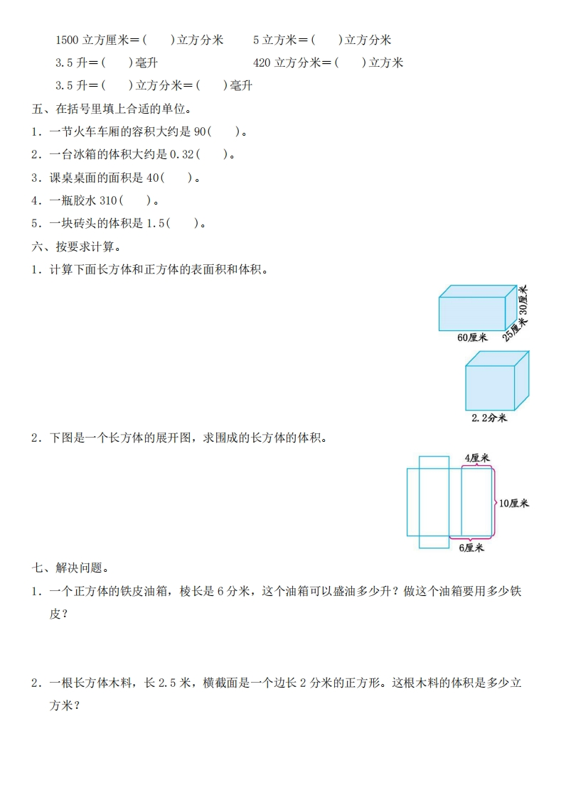 长方体和正方体测试卷(一)一、填空题。1.正方体是()都相等的长方体,如果用V表示体积,用α表示正方体的棱长,那么=()。2.一个长方体,长4分米,宽3分米,高2分米,它的棱长总和是()分米,它最大的一个面的面积是()平方分米,表面积是()平方分米,体积是()立方分米。3.一个正方体的棱长是2米,它的占地面积是()平方米,表面积是()平方米,体积是()立方米。4.一个正方体的棱长如果扩大到原来的2倍,那么表面积扩大到原来的()倍,体积扩大到原来的()倍。5.每瓶医用酒精500毫升,装120瓶需要酒精()升,如果有3.5立方分米的酒精,可装()瓶。二、判断题。(对的画“√”,错的画“×”)》1.正方体是特殊的长方体。()2.体积单位之间的进率是1000。()3.长方体的6个面不可能有正方形。()4.瓶子里装了500毫升的水,瓶子的容积是500毫升。()5.体积单位比面积单位大。()6.一个正方体的棱长扩大到原来的2倍,它的体积也要扩大到原来的2倍。()三、选择题。1.一个电饭锅能盛水3()。A.升B.毫升C.立方米2.把一个长方体放在桌面上,最多可以看到()个面。A.2B.3C.43.求做一只油桶需要多少铁皮是求()。A.表面积B.体积C.容积4.把三个棱长是1厘米的正方体拼成一个长方体,这个长方体的表面积比原来3个正方体表面积之和减少了()平方厘米。A.2B.3C.45.把一个棱长为3厘米的正方体锯成棱长是1厘米的小正方体,可锯成()个。A.6B.9C.27四、在括号里填上适当的数。