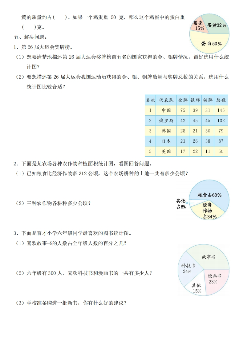 扇形统计图测试卷(一)一、填空题。1.要记录一个病人的体温变化情况,应该绘制()统计图。2.要描述5名运动员的400米比赛成绩,应该绘制()统计图。3.要描述某村副业收入与总收入之间的关系,应该绘制()统计图。4.既要表示数量的多少,又要反映数量的增减变化,应该绘制()统计图。二、选择题。1.要表示出某工厂数月来每个月的生产量,用()比较合适。A.条形统计图B.折线统计图C.扇形统计图2.医院护士要每隔4小时给病人量一次体温,并把体温的变化情况用统计图表示出来,应制成()比较合适。A.条形统计图B.折线统计图C.扇形统计图3.某班男、女生情况如图,男生人数占全班人数的()。男生26A.26%B.48%C.52%女生244.空气中含有21%的氧气,在200L空气中含有()L氧气。A.100B.42C.215.永兴超市春节期间共运来水果420千克,其中橘子运来120千克,香蕉运来50千克,那么,橘子约占运来水果的(),香蕉约占运来水果的()。A.28.6%B.32.5%C.11.9%三、判断题。(对的画“√”,错的画“X”)1.折线统计图就是按照数据的大小描出各点,再把各点用线段连接起来。()2.条形统计图和折线统计图都能反映数量的增减变化情况。()3.统计图比统计表更形象、直观,数量关系更明显。()4.为了能清楚地看出某地区各月份的降水量的多少及变化情况,应该绘制条形统计图。()四、看图填空。数量/册6001.某中心小学2008~2011年学校图书馆购书情况如图。600500500根据上图中的信息,回答下面的问题。400380300(1)()年购书本数最多,()年购书本数最少。300200(2)2011年购书本数比2008年多()%。100(3)你认为这个学校购书本数的变化趋势怎样?02008200920102011年份2.右边是鸡蛋各部分质量统计图。从图中我们可以看出:一个鸡蛋中蛋壳的质量约占(),蛋