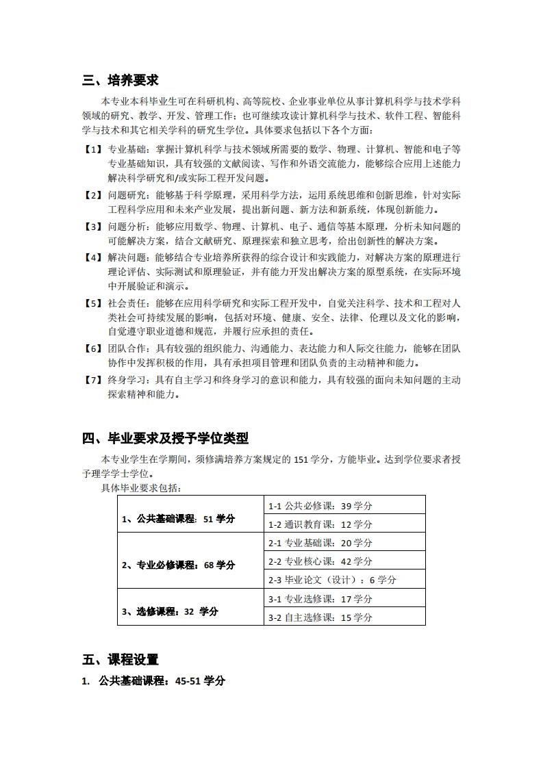 北京大学信息科学技术学院计算机科学与技术专业(图灵班)培养方案一、专业简介计算机科学与技术是研究计算机理论、软件、硬件和应用的基础学科,是人类社会信息化、智能化发展的重要基础。本学科是在现代数学和物理、信息论、电子和微电子等技术发展的基础上形成的多学科交叉的宽口径专业。传统的研究领域包括计算机理论和软件、计算机系统结构、计算机应用和人工智能等。进入21世纪,随着互联网、云计算、大数据、物联网和人工智能的飞速发展,更加拓宽了计算机科学与技术的研究范围,为该学科的发展注入了新的活力。计算机科学与技术专业是国家级一流本科专业建设点,由信息科学技术学院和计算机学院共同建设。本专业的突出特色是“重视数理基础、强化系统能力、鼓励交叉创新”,坚持以学生为本,坚持通识和专业教育相融合的培养模式,培养计算机学科基础理论扎实、在计算机学科前沿开拓创新能力强、同时具有国际视野的未来领军人才。2017年,北京大学正式创办“图灵班”,致力于为中国培养计算机科学界下一代领军人物。图灵班由信息科学技术学院与计算机学院共建。图灵奖获得者、计算机科学领域的大师约翰·霍普克罗夫特(John Hopcroft)教授担任图灵班指导委员会主任。图灵奖获得者Manuel Blum教授和Silvio Micali教授担任图灵班导师,参与指导培养方案及课程体系的建设,并亲自为图灵班同学授课。二、培养目标培养学生成为具有“引领未来、守正创新”的精神,具有国际视野和爱国散业意识,具有“基础厚实、理工交叉、乐于探究、勇于创新”特点,能够成为新一代计算机软件和理论、计算机系统结构、计算机应用和人工智能等领域引领计算机科学与技术学科发展创新的领军人才。通过通识与专业相结合的教育,使学生具备坚实的数学、物理、计算机、智能、电子等计算机软硬件基础知识,系统地掌握计算机科学的理论和方法,受到良好的科学思维与科学实践研究的训练,具有探索、发现、分析和解决问题的能力,以及知识自我更新和不断创新的能力,为引领计算机科学与技术发展奠定基础。培养的学生具有正确的人生观和价值观,具有良好的人文和科学素养,具有独立思考、阅读、写作、表达等能力和国际化视野。“图灵班”的设立旨在打造深具北大特色的计算机类本科生培养计划,建立课程教学与科研培养的示范体系,全面提升北京大学计算机和人工智能学科的教育与人才培养水平,为国家培养计算机领域未来的领军人才。