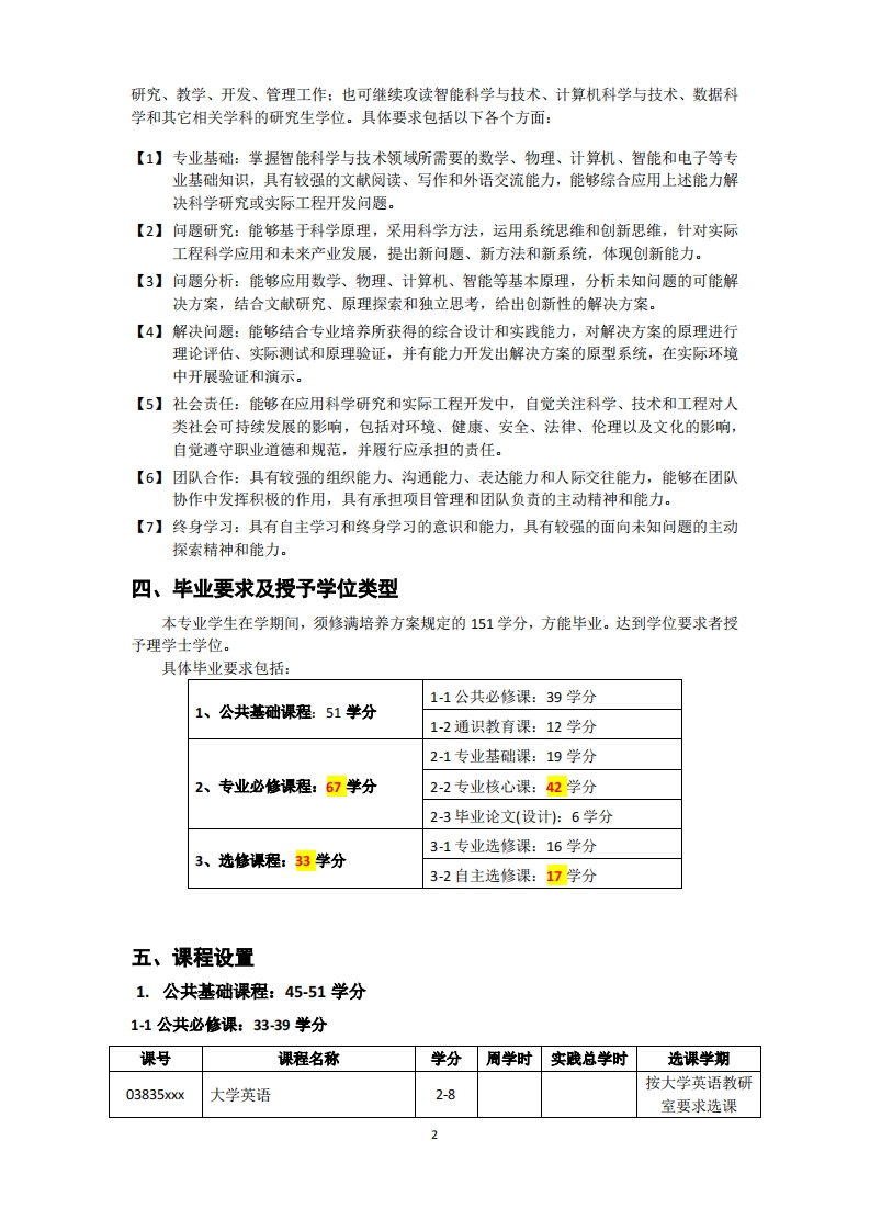 北京大学信息科学技术学院智能科学与技术专业(智班)培养方案专业简介智能科学与技术是研究自然智能形成机理与人工智能实现理论、方法、技术和应用的基础学科,是推动人类社会从信息化时代迈向智能化时代的核心力量。本学科是在计算机科学与技术、数学、物理、心理学、哲学和认知科学等基础上发展起来的一门以多学科交叉为特色的新兴学科。主要研究领域包括计算机视觉、自然语言处理、多模态学习、机器学习、多智能体、认知与推理、机器人学、可视模拟、类脑智能、数据智能分析与智能计算等。随着近年来智能化成为各行各业的引领变革趋势,人工智能亦成为大国竞争的关键战略领域,智能科学与技术学科的发展日新月异、方兴未艾。智能科学与技术专业由信总科学技术学院和智能学院共同建设。本专业的突出特色是“重视数理基础与计算技术、强化智能理论与科学方法、注重技术体系与工程实践、鼓励交叉融合与领域创新”,坚持以学生为本,坚持通识和专业教育相融合的培养模式,开设以“人工智能引论、计算机视觉、可视计算与交互概论、自然语言处理基础、多模态学习、机器学习、多智能体基础、认知推理”等为核心的智能学科专业必修课程群,培养智能科学基础理论扎实、在人工智能领域前沿开拓创新能力强、同时具有国际视野的未来领军人才。2022年,北京大学信息科学技术学院正式创办“智能科学与技术专业实验班”(简称“智班”),承载我国第一个智能科学与技术专业的历史积淀,注重理工强基础、深交叉,聚合优质资源,致力于为中国培养智能科学新一代领军人物。二、培养目标本专业的培养目标为:毕业生具有“引领未来、守正创新”的精神,具有国际视野和爱国敬业意识,具有“基础实、学科交叉、善于探究、勇于创新”特点,能够成为新一代人工智能领域引领智能科学与技术发展创新的领军人才。通过通识与专业相结合的教育,使学生具备坚实的数学、物理、计算机、智能、电子等基础知识,系统地掌握智能科学与技术的理论和方法,受到良好的科学思维与科学实践研究的训练,具有探索、发现、分析和解决问题的能力,以及知识自我更新和不断创新的能力,为引领智能科学与技术发展奠定基础。培养的学生具有正确的人生观和价值观,具有良好的人文和科学素养,具有独立思考、阅读、写作、表达等能力和国际化视野。“智班”的设立旨在打造深具北大特色的智能科学类本科生培养计划,建立课程教学与科研培养的示范体系,全面提升北京大学智能学科的教育与人才培养水平,为国家培养智能科学领域未来的领军人才。三、培养要求本专业本科毕业生可在科研机构、高等院校、企业事业单位从事智能科学与技术相关的