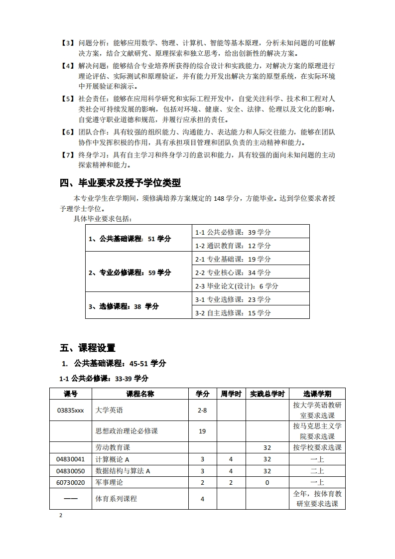 北京大学信息科学技术学院智能科学与技术专业培养方案一、专业简介智能科学与技术是研究自然智能形成机理与人工智能实现理论、方法、技术和应用的基础学科,是推动人类社会从信息化时代迈向智能化时代的核心力量。本学科是在计算机科学与技术、数学、物理、心理学、哲学和认知科学等基础上发展起来的一门以多学科交叉为特色的新兴学科。主要研究领域包括计算机视觉、自然语言处理、多模态学习、机器学习、多智能体、认知与推理、机器人学、可视模拟、类脑智能、数据智能分析与智能计算等。随着近年来智能化成为各行各业的引领变革趋势,人工智能亦成为大国竞争的关键战略领域,智能科学与技术学科的发展日新月异、方兴未艾。智能科学与技术专业由信息科学技术学院和智能学院共同建设。本专业的突出特色是“重视数理基础与计算技术、强化智能理论与科学方法、注重技术体系与工程实践、鼓励交叉融合与领域创新”,坚持以学生为本,坚持通识和专业教育相融合的培养模式,开设以“人工智能引论、计算机视觉、可视计算与交互概论、自然语言处理基础、多模态学习、机器学习、多智能体基础、认知推理”等为核心的智能学科专业必修课程群,培养智能科学基础理论扎实、在人工智能领域前沿开拓创新能力强、同时具有国际视野的未来领军人才。二、培养目标本专业的培养目标为:毕业生具有“引领未来、守正创新”的精神,具有国际视野和爱国敬业意识,具有“基础札实、学科交叉、善于探究、勇于创新”特点,能够成为新一代人工智能领域领智能科学与技术发展创新的领军人才。通过通识与专业相结合的教育,使学生具备坚实的数学、物理、计算机、智能、电子等基础知识,系统地掌握智能科学与技术的理论和方法,受到良好的科学思维与科学实践研究的训练,具有探索、发现、分析和解决问题的能力,以及知识自我更新和不断创新的能力,为引领智能科学与技术发展奠定基础。培养的学生具有正确的人生观和价值观,具有良好的人文和科学素养,具有独立思考、阅读、写作、表达等能力和国际化视野。三、培养要求本专业本科毕业生可在科研机构、高等院校、企业事业单位从事智能科学与技术相关的研究、教学、开发、管理工作:也可继续攻读智能科学与技术、计算机科学与技术、数据科学和其它相关学科的研究生学位。具体要求包括以下各个方面:【1】专业基础:掌握智能科学与技术领域所需要的数学、物理、计算机、智能和电子等专业基础知识,具有较强的文献阅读、写作和外语交流能力,能够综合应用上述能力解决科学研究或实际工程开发问题。【2】问题研究:能够基于科学原理,采用科学方法,运用系统思维和创新思维,针对实际工程科学应用和未来产业发展,提出新问题、新方法和新系统,体现创新能力。