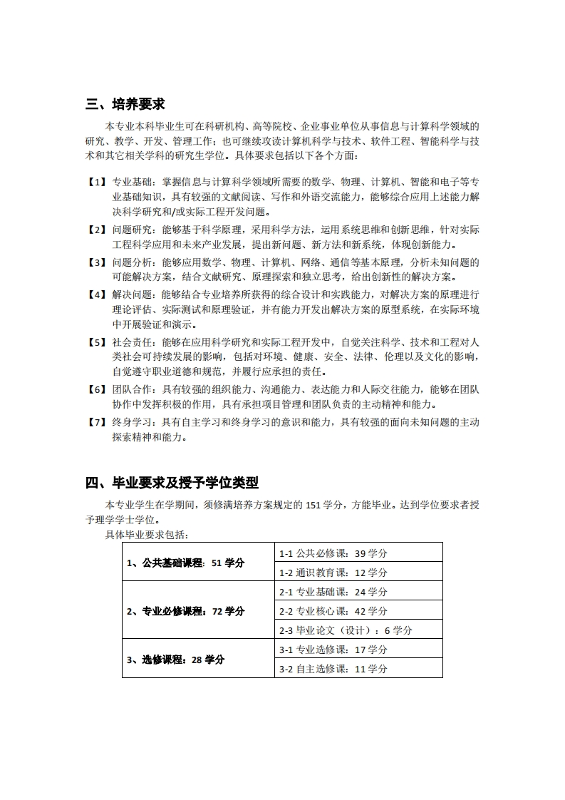 北京大学信息科学技术学院信息与计算科学专业(图灵班)培养方案一、专业简介信息与计算科学是研究信息与计算的理论、软件、系统和应用的基础学科,是人类社会信息化、智能化发展的重要基础。本学科是在现代数学和物理、信息论、计算机和电子等技术发展的基础上形成的多学科交叉的宽口径专业。传统的研究领域包括信息科学、计算理论、信息与计算系统、信总与计算应用和人工智能等。进入21世纪,随着互联网、云计算、大数据、物联网和人工智能的飞速发展,更加拓宽了信息与计算科学的研究范围,涵盖了高端芯片与软件、智能科技和国家安全等关键领域,为该学科的发展注入了新的活力。2017年,北京大学正式创办“图灵班”,致力于为中国培养计算机科学界下一代领军人物。图灵班由信息科学技术学院与计算机学院共建。图灵奖获得者、计算机科学领域的大师约翰·霍普克罗夫特(John Hopcroft)教授担任图灵班指导委员会主任。图灵奖获得者Manuel Blum教授和Silvio Micali教授担任图灵班导师,参与指导培养方案及课程体系的建设,并亲自为图灵班同学授课。信息与计算科学专业为面向“强基计划”的招生专业,招收对信息与计算科学有浓厚兴趣,在信息或数理化生等方面有专长的学科交叉人才。强基计划学生将会优先推荐到图灵班等优秀本科生培养计划,并通过本硕博贯通的个性化培养,在信息与计算科学、计算机软件与理论、计算机系统结构、计算机应用、智能科学与技术、软件工程等方向攻读硕士或博士学位,培养有志于服务国家重大战略需求且基础理论扎实、在信总与计算学科前沿开拓创新能力强、同时具有国际视野的未来领军人才。二、培养目标培养学生成为具有“引领未来、守正创新”的精神,具有国际视野和爱国敬业意识,具有“基础厚实、理工交叉、乐于探究、勇于创新”特点,能够成为新一代大数据系统与技术、计算机软件和理论、计算机系统结构、计算机应用和人工智能等领域引领数据科学与大数据技术发展创新的领军人才。通过通识与专业相结合的教育,使学生具备坚实的数学、计算机、数据科学、人工智能等计算机软硬件基础知识,系统地掌握数据科学和大数据技术的理论和方法,受到良好的科学思维与科学实践研究的训练,具有探索、发现、分析和解决问题的能力,以及知识自我更新和不断创新的能力,为引领数据科学与大数据技术发展奠定基础。培养的学生具有正确的人生观和价值观,具有良好的人文和科学素养,具有独立思考、阅读、写作、表达等能力和国际化视野。“图灵班”的设立旨在打造深具北大特色的计算机类本科生培养计划,建立课程教学与科研培养的示范体系,全面提升北京大学计算机和人工智能学科的教育与人才培养水平,为国家培养计算机领域未来的领军人才。