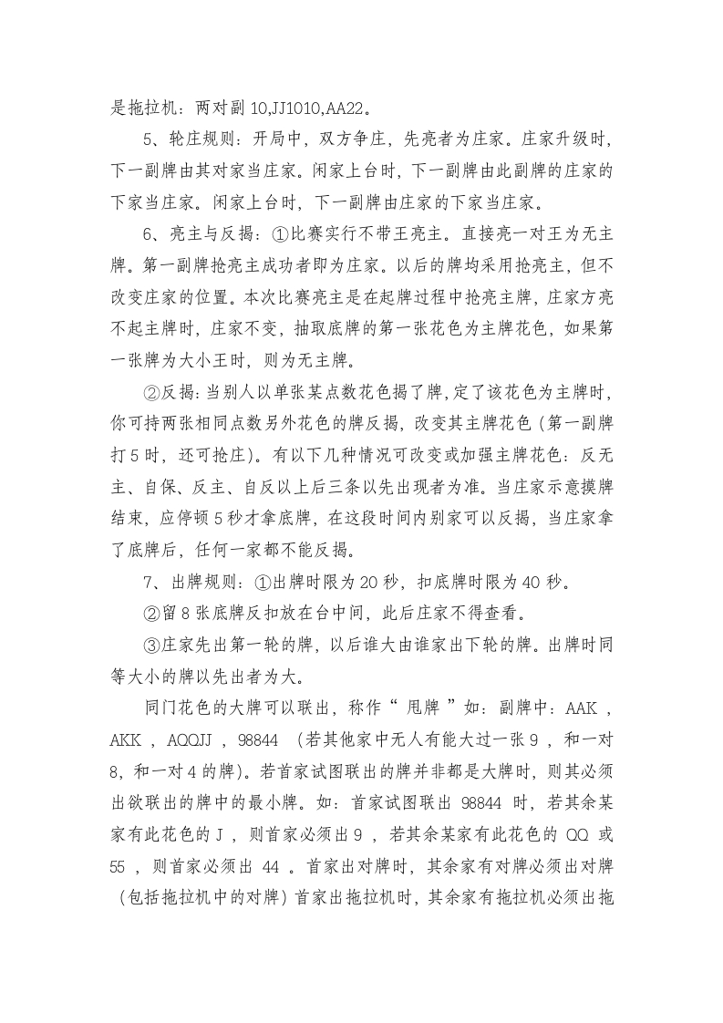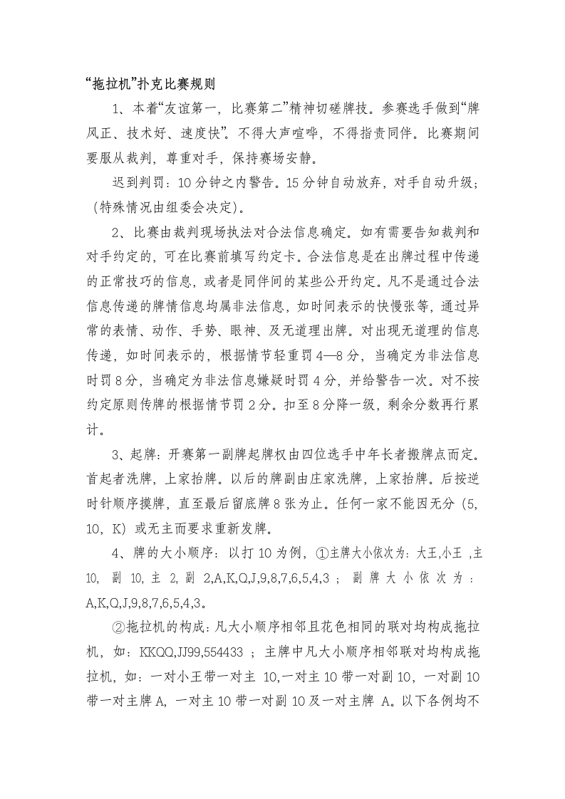 “拖拉机”扑克比赛规则1、本着“友谊第一,比赛第二”精神切磋牌技。参赛选手做到“牌风正、技术好、速度快”。不得大声喧哗,不得指责同伴。比赛期间要服从裁判,尊重对手,保持赛场安静。迟到判罚:10分钟之内警告。15分钟自动放弃,对手自动升级;(特殊情况由组委会决定)。2、比赛由裁判现场执法对合法信息确定。如有需要告知裁判和对手约定的,可在比赛前填写约定卡。合法信息是在出牌过程中传递的正常技巧的信息,或者是同伴间的某些公开约定。凡不是通过合法信息传递的牌情信息均属非法信息,如时间表示的快慢张等,通过异常的表情、动作、手势、眼神、及无道理出牌。对出现无道理的信息传递,如时间表示的,根据情节轻重罚4一8分,当确定为非法信息时罚8分,当确定为非法信息嫌疑时罚4分,并给警告一次。对不按约定原则传牌的根据情节罚2分。扣至8分降一级,剩余分数再行累计。3、起牌:开赛第一副牌起牌权由四位选手中年长者搬牌点而定。首起者洗牌,上家抬牌。以后的牌副由庄家洗牌,上家抬牌。后按逆时针顺序摸牌,直至最后留底牌8张为止。任何一家不能因无分(5,10,K)或无主而要求重新发牌。4、牌的大小顺序:以打10为例,①主牌大小依次为:大王,小王,主10,副10,主2,副2,A,K,Q,J,9,8,7,6,5,4,3;副牌大小依次为:A,K,Q,J,9,8,7,6,5,4,3。②拖拉机的构成:凡大小顺序相邻且花色相同的联对均构成拖拉机,如:KQ0,JJ99,554433;主牌中凡大小顺序相邻联对均构成拖拉机,如:一对小王带一对主10,一对主10带一对副10,一对副10带一对主牌A,一对主10带一对副10及一对主牌A。以下各例均不