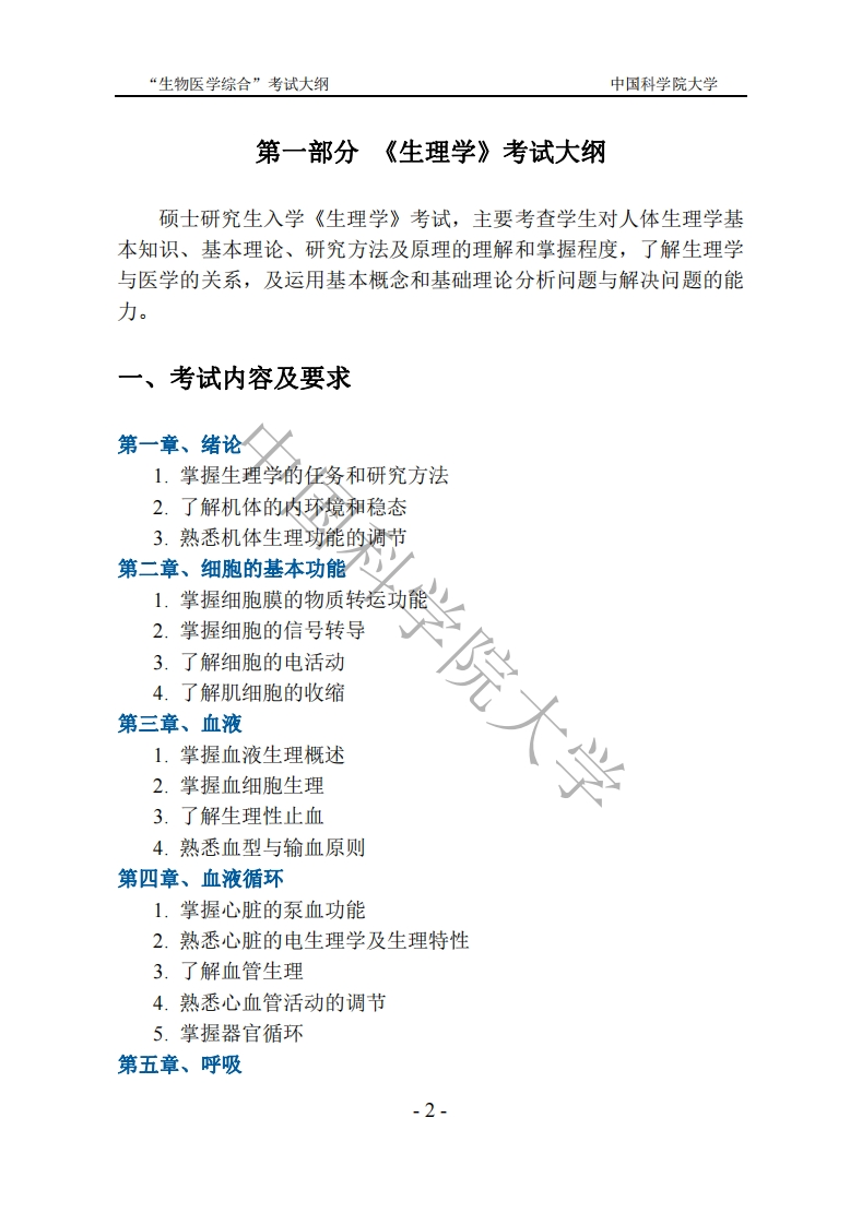 “生物医学综合”考试大纲中国科学院大学中国科学院大学硕士研究生入学《生物医学综合》考试大纲考试目的硕士研究生入学《生物医学综合》考试,旨在了解学生对“生理学”、“生物化学与分子生物学”、“医学细胞生物学”和“医学免疫学”的基本知识、基本理论、研究方法及其原理的理解和掌握情况,也考察学生综合分析和解决问题的能力。考试形式和考试时间硕士研究生入学《生物医学综合》考试为闭卷笔试,考试时间为3小时,总分为300分。试卷结构(题型)题型包括名词解释(包括英译汉、汉译英等)<选择题、判断题、简述题和综合分析题。考试内容及要求请查看考试大纲。四部分组成的考试大纲,涵盖了“生理学”、“生物化学与分子生物学”、“医学细胞生物学”和“医学免疫学”的考试内容及要求。-1-