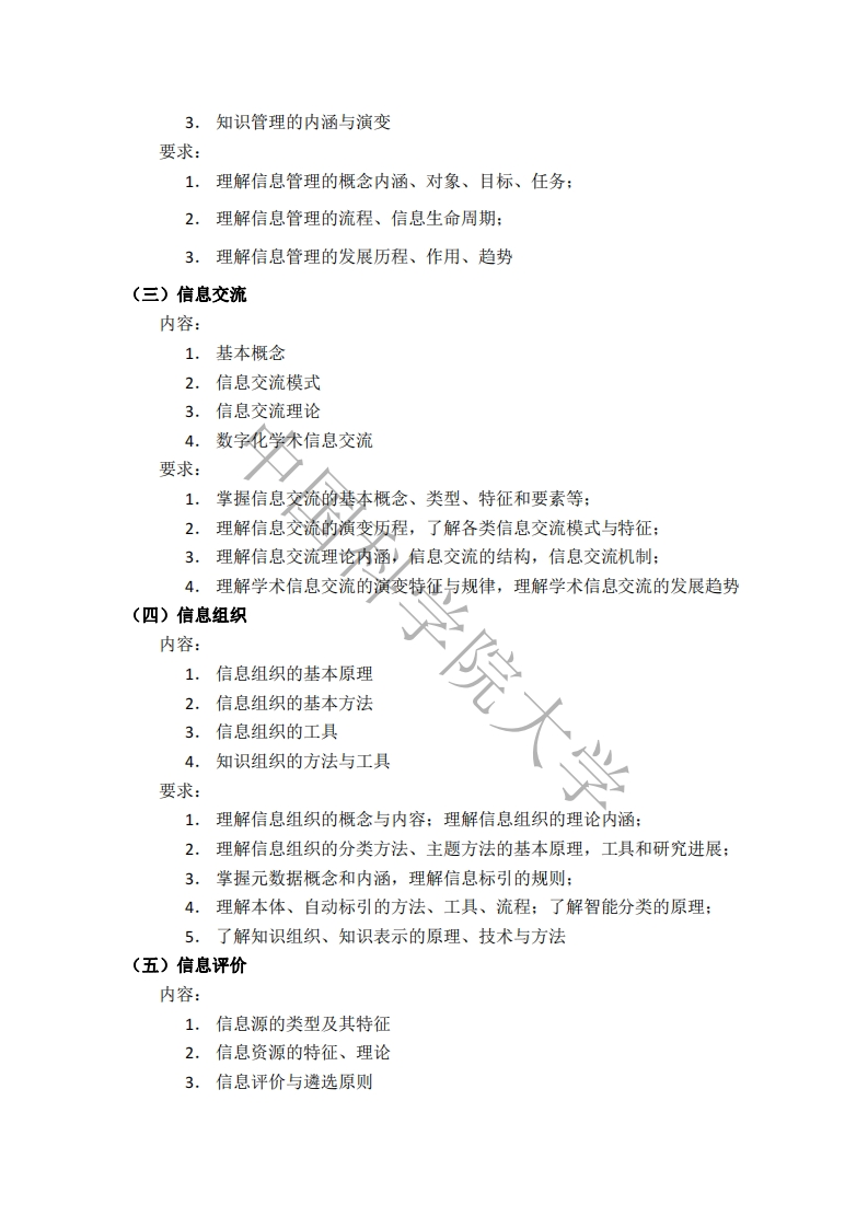 中国科学院大学硕士研究生入学考试《情报学基础》考试大纲一、考试科目基本要求及适用范围本《大纲》适用于中国科学院大学情报学专业的硕士研究生入学考试。本科目的考试,要求考生理解信息、情报的基本含义,掌握信息管理、信息分析(情报研究)、信息系统的基本原理与方法:了解情报学发展历程与基础理论、情报组织的方法原理、情报服务的方法原理:掌握文献计量学、科学计量学的原理与方法:了解情报工作和情报研究的基本流程、原理与方法:了解当前情报学、情报技术发展的前沿和趋势,以及研究热点。二、考试形式和试卷结构考试形式为闭卷,笔试,考试时间为180分钟,总分为150分:试卷题型包括:基础知识(60分入、简答题30分)人、论述题(60分)。三、考试内容(一)信息与情报内容:1.信息概念与特征2.情报概念与特征3.信息化与信息社会学院大学要求:1.了解信息的内涵与外延,理解信息的作用与意义:理解信息的类型与信息链:2.理解情报的内涵与外延,理解情报的作用与意义:理解情报与信息的联系与区别:3.理解信息化、数字化、数据化的内涵与特点,理解信息社会的内涵与趋势:(二)信息管理内容:1.信息管理的概念、对象、目标2.信息管理的发展历程与内涵演变