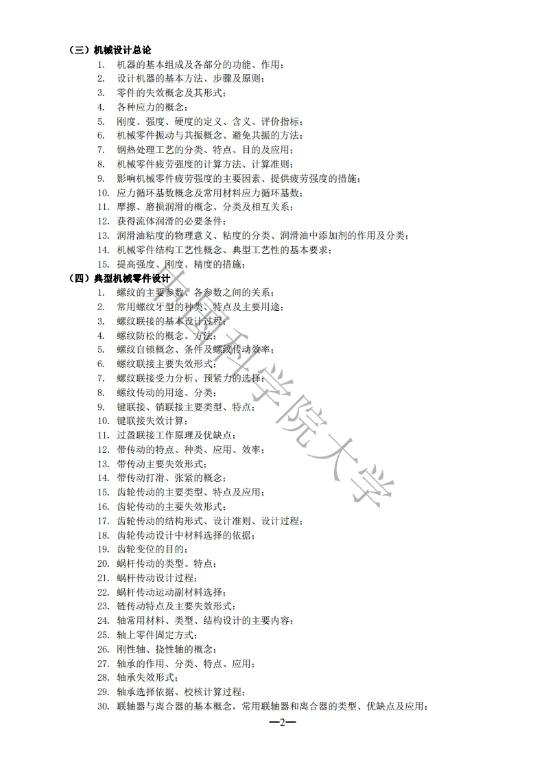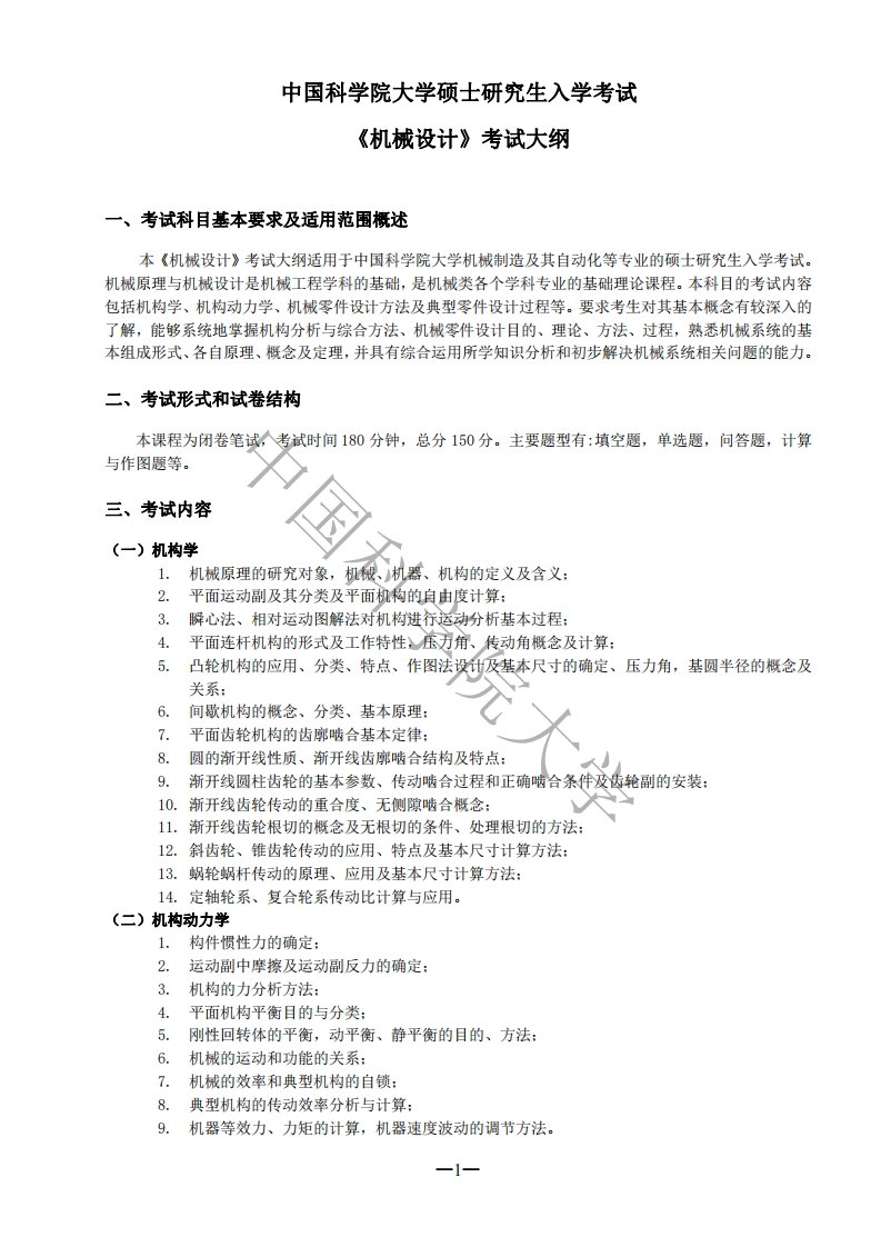 中国科学院大学硕士研究生入学考试《机械设计》考试大纲一、考试科目基本要求及适用范围概述本《机械设计》考试大纲适用于中国科学院大学机械制造及其自动化等专业的硕士研究生入学考试。机械原理与机械设计是机械工程学科的基础,是机械类各个学科专业的基础理论课程。本科目的考试内容包括机构学、机构动力学、机械零件设计方法及典型零件设计过程等。要求考生对其基本概念有较深入的了解,能够系统地掌握机构分析与综合方法、机械零件设计目的、理论、方法、过程,熟悉机械系统的基本组成形式、各自原理、概念及定理,并具有综合运用所学知识分析和初步解决机械系统相关问题的能力。二、考试形式和试卷结构本课程为闭卷笔试,考试时间180分钟,总分150分。主要题型有:填空题,单选题,问答题,计算与作图题等。三、考试内容(一)机构学1.机械原理的研究对象,机械、机器、机构的定义及含义:2.平面运动副及其分类及平面机构的自由度计算:3.瞬心法、相对运动图解法对机构进行运动分析基本过程:4.平面连杆机构的形式及工作特性,压力角、传动角概念及计算:5.凸轮机构的应用、分类、特点、作图法设中及基本尺寸的确定、压力角,基圆半径的概念及关系:6.间歇机构的概念、分类、基本原理:7.平面齿轮机构的齿廓啮合基本定律:8.圆的渐开线性质、渐开线齿廓啮合结构及特点:9.渐开线圆柱齿轮的基本参数、传动啮合过程和正确啮合条件及齿轮副的安装:10.渐开线齿轮传动的重合度、无侧隙啮合概念:11.渐开线齿轮根切的概念及无根切的条件、处理根切的方法:12.斜齿轮、锥齿轮传动的应用、特点及基本尺寸计算方法:13.蜗轮蜗杆传动的原理、应用及基本尺寸计算方法:14.定轴轮系、复合轮系传动比计算与应用。(二)机构动力学1.构件惯性力的确定:2.运动副中摩擦及运动副反力的确定:3.机构的力分析方法:4.平面机构平衡目的与分类:5.刚性回转体的平衡,动平衡、静平衡的目的、方法:6.机械的运动和功能的关系:7.机械的效率和典型机构的自锁:8.典型机构的传动效率分析与计算:9.机器等效力、力矩的计算,机器速度波动的调节方法。-1