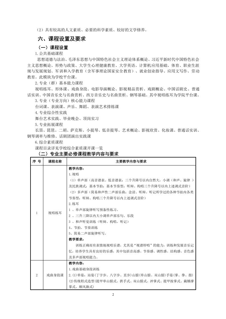 表演艺术专业人才培养方案一、专业名称及代码专业名称:表演艺术专业代码:550204二、入学要求高中阶段教育毕业生或具有同等学历者三、修业年限基本三年,最长五年四、职业面向本专业所属文化艺术大类(代码55)。就业岗位就业范围具体工作任务与专业相关的职业技能等级证书例举社会各级文艺团体、文化传播运用所学习的声乐演唱与舞台表演技歌唱、影视演员五级电影电视演员演艺公司、影视公司能进行舞台表演工作(国家职业资格五文艺宣传干事、文运用所学的音乐技能进行音乐节目与企事业单位文艺宣传部门级)、四级电影电艺节目编导音乐活动的策划、组织、编排工作。视演员(国家职业播音主持、节目策运用所学知识与技能对稿件进行编辑、广播电台、电视台资格四级)等划整理,播出工作。五、培养目标与培养规格(一)培养目标本专业主要培养掌握音乐与表演艺术的基础知识,具有较好的声乐演唱、影视表演和舞台表演的能力,拥有较为全面的艺术文化修养、较好的专业素质,面向社会各级文艺团体、文化传播演艺公司、广播电台与电视台、企事业单位文艺宣传部门等单位,适应音乐指挥、文艺宣传干事、节目编导、影视演员、文艺活动的组织与策划等岗位需要的高素质技术技能型人才。(二)培养规格1.知识要求(1)具备良好的文化底蕴与艺术涵养:(2)掌握声乐、台词、舞蹈、舞台表演的基础知识:(3)熟悉现代传播媒介与文艺演出市场:(4)学习中外戏剧发展的历史与知识,了解各艺术领域中经典作品与代表人物。2.能力要求(1)具有声乐演唱、舞蹈形体、舞台表演的基础实操能力:(2)掌握丰富的实训活动基本能力和表演技能:(3)具有良好的语言表达能力和写作能力:(4)具有较好的艺术审美能力和艺术鉴赏能力。3.素质要求(1)备良好的政治思想素质,职业道德素质,团队意识: