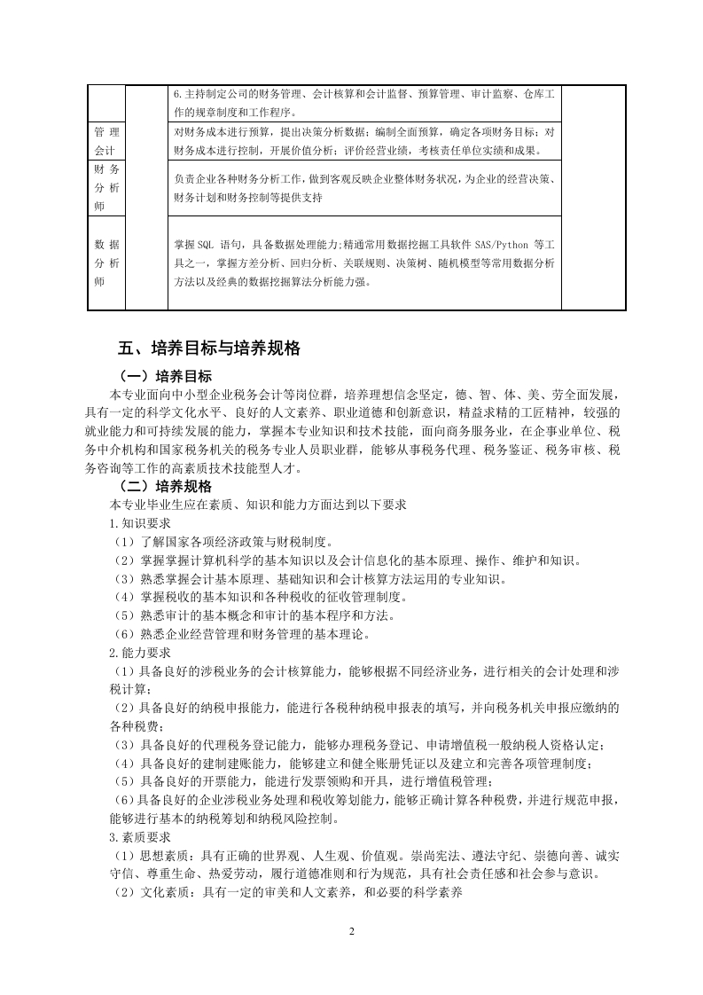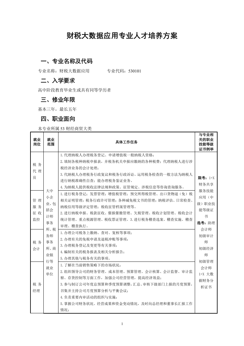 财税大数据应用专业人才培养方案一、专业名称及代码专业名称:财税大数据应用专业代码:530101二、入学要求高中阶段教育毕业生或具有同等学历者三、修业年限基本三年,最长五年四、职业面向本专业所属53财经商贸大类与专业相就业就业关的职业岗位范围具体工作任务技能等级证书例举1.代理纳税人办理税务登记、申请增值税一般纳税人资格:2.填制各税种纳税申报表,并税务机关申报应缴纳的各种税费:代理纳税人进行涉税务代理税经济业务的会计处理:号3.代纳税人办理税务行政复议和税务行政诉讼。运用税务检查的一般方法为纳税人进行纳税准确性自查:能办理税务鉴证业务。限考:1+X4.为纳税人提供税收法律法规和政策、征管规定、涉税信息等咨询查询服务。财务共享大中服务技能1.进行税务登记:发票管理:增值税管理:预交所得税管理、出口货物退(免)税小企应用(中管理相关证明管理:税务行政许可管理:各种减免税文书的管理:纳税评估、日常检查、业,包级)职业技服务纳税信用等级评定管理:税收征管档案管理等。括会能等级证征收2.进行纳税申报、税款征收、催报催缴管理、欠税管理、税收计划管理、税收会计计师监控统计管理、重点税源管理、税收票证管理。3.进行税务稻查选案、稻查实施、稻查匆事务选考:助理审理、稻查执行。所、税会计师1.办理公司税务上缴纳、查对、复核等事项:务师初级审计2.办理有关的免税申请及退税冲账等事项:税务事务师3.办理税务登记及变更等有关事项:会计所、商初级经济4.编制有关的税务报表及相关分析报告:业银师5.办理其他与税务有关的事项。行等初级管理就业1.了解在当前销售策路下的市场状况:会计师单位2.组织领导公司的财务管理、成本管理、预算管理、会计核算、会计监督、审计监1+X大数察、存货控制等方面工作,加强公司经营管理,提高经济效益:据财务分税务3.参与制订公司年度总预算和季度预算调整,汇总、审核下级部门上报的月度预算析证书经理召集并主持公司月度预算分析与平衡会议:4.负责重要内审活动的组织与实施:5.掌握公司财务状况、经营成果和资金变动情况,及时向总经理和董事长汇报工作情况: