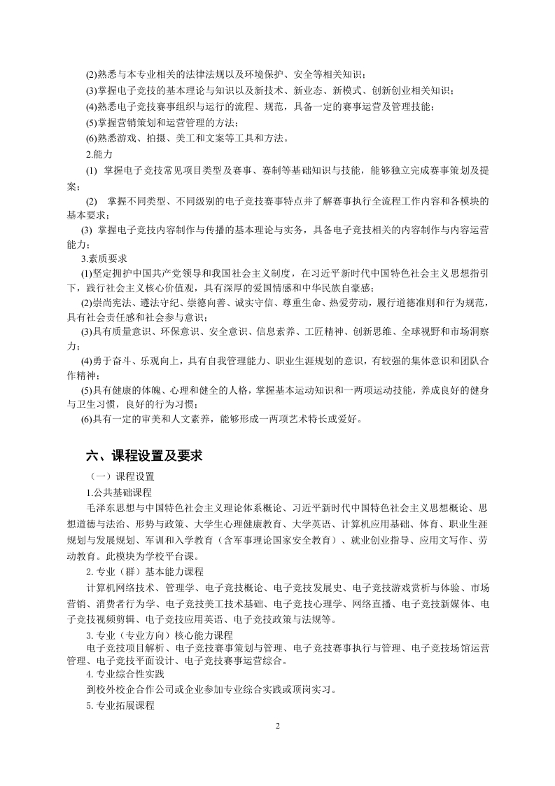 电子竞技运动与管理专业人才培养方案一、专业名称及代码专业名称:电子竞技运动与管理专业代码:570312二、入学要求高中阶段教育毕业生或具有同等学历者三、修业年限基本三年,最长五年四、职业面向本专业属于体育大类(57)。就业岗位就业范围具体工作任务与专业相关的职业技能等级证书例举面向电子竞限考:技行业相关1+X电子竞技赛事运企事业单营职业等级证书位,涵盖电选考:电子竞技专业人员子竞技赛事电竞运动组织与指导、电竞活动营销策划和运其他电竞活动策划推公司、电子营管理、电竞组织、电竞活动和赛事的管理与广、运营竞技场馆运服务,电竞赛事文创、主持和影视制作等电竞管理、服务与营公司、电技术支持子竞技媒体类企业、电子竞技俱乐部等五、培养目标与培养规格(一)培养目标本专业培养理想信念坚定,德、智、体、美、劳全面发展,具有一定的科学文化水平,良好的人文素养、职业道德和创新意识,精益求精的工匠精神,较强的就业能力和可持续发展的能力:掌握电子竞技的基本理论与知识,熟悉电子竞技赛事组织与运行的流程、规范,具备一定的赛事运营及管理技能,能从事电竞技相关的宣传、策划、运营、管理等工作的高素质技术技能型人才。(二)培养规格1.知识要求(1)掌握必备的思想政治理论、科学文化基础知识和中华优秀传统文化知识: