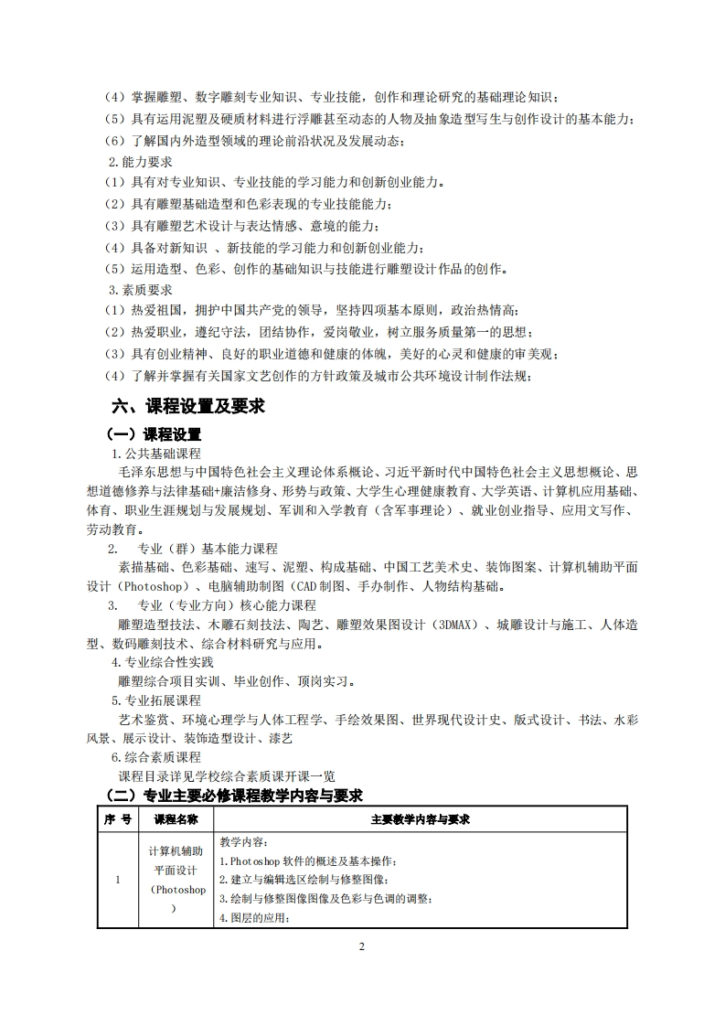 雕塑设计专业人才培养方案一、专业名称及代码专业名称:雕塑设计专业专业代码550126二、入学要求高中阶段教育毕业生或具有同等学历者三、修业年限基本三年,最长五年四、职业面向本专业所属文化艺术大类(代码55)。就业岗位就业范国具体工作任务与专业相关的职业技能等级证书例举具备雕塑艺术的基本知识和基本技能,雕塑艺术设计师雕塑企业装饰壁画制作公司具有一定艺术素养,从事雕塑、装饰壁画以及小型装饰品的创作设计。掌握数字雕刻技术,有较高的艺术修养游戏动漫公司和较强的造型能力,具有独立完成创作数码雕塑师文化创意公司的能力.运用数字雕刻专业知识能够根宣传部门据公司的设计理念或风格,协助设计主工艺美术师、雕塑传统文化推广等管完成设计任务,并能够根据设计款式完成产品的创意说明。艺术设计师、美术根据客户需求,完成对设计方案制作及教育指导师效果图的制作,能够表达设计意图协助起版高级技工做一些的电脑起版工艺美术师工艺产品设计制造公司工作在各级艺术馆、展览馆、文化馆(站)从事美术创作和辅导工作,在出版社、报刊杂志社从事美术编辑工作。五、培养目标与培养规格(一)培养目标本专业主要培养养具备雕塑设计的基本知识和基本技能,具有一定艺术素养,德、智、体、美全面发展,具有良好职业道德、人文素养和民族文化素质,面向粤港澳大湾区文化艺术部门、科研单位、雕塑艺术设计等岗位需要的从事雕塑、数字雕刻、装饰壁画以及小型装饰品的创作设计的高素质技术技能型人才。(二)培养规格1.知识要求(1)掌握雕塑基本材料和表现技法,掌握基础造型和色彩表现的专业技能:(2)理解掌握立体造型的基本理论知识:(3)掌握并运用在三维空间中进行造型设计创作的技术与基本方法: