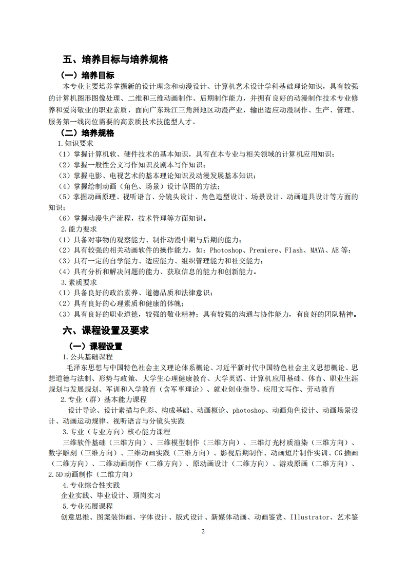 动漫制作技术人才培养方案一、专业名称及代码专业名称:动漫制作技术专业代码:510215二、入学要求高中阶段教育毕业生或具有同等学历者三、修业年限基本三年,最长五年四、职业面向本专业所属电子与信息大类(代码51)。就业岗位就业范四具体工作任务与专业相关的职业技能等级证书例举动画制作公司、影视制作公根据设计稿创建三维生物模型、道具模三维模型制作(三司、网络游戏公司、新闻媒介型、场景模型,根据场景原画稿完成场维方向)部门、网络与多媒体制作公景模型。根据原画图纸完成建筑模型或司、专业设计公司、广告公司工业产品模型。动画制作公司、影视制作公虚拟角色的骨骼设置,运动控制设置:三维动画制作(三司、网络游戏公司、新闻媒介简易动画角色的制作:摄影机动画制维方向)部门、网络与多媒体制作公作:精细动画制作:测试渲染:动画的限考:数字创意建司、专业设计公司、广告公司修改完普。模、动画制作、文创产品数字化根据影视动画项目的需要,绘制简单的设计、数字艺术创动画制作公司、影视制作公动画台本。根据动画角色的特点绘制原作、数字影视特效二维动画制作(二司、网络游戏公司、新闻媒介动画,绘制动画中间画,根据背景设计制作1+X技能证书维方向)部门、网络与多媒体制作公稿绘制动画背景、动画镜头描线、动画选考:Adobe平面设司、专业设计公司、广告公司镜头校对、样片剪辑,动画后期合成。计师、助理动画设计师、动画绘制员、插画公司、动画制作公司、影Adobe影视后期设插画设计(二维方美术设计、漫画、连环画、插图、海报向)视制作公司、网络游戏公司、等设计计师广告据项目要求确立剪辑的艺术风格:影片动画制作公司、影视制作公的粗剪:根据情节需要、场景的过渡精司、网络游戏公司、新闻媒介影视剪辑部门、网络与多媒体制作公剪:时间效果与过场效果的添加:输入司、专业设计公司、广告公司声音文件进行音画对位编辑:输出样片:审核,输出成品