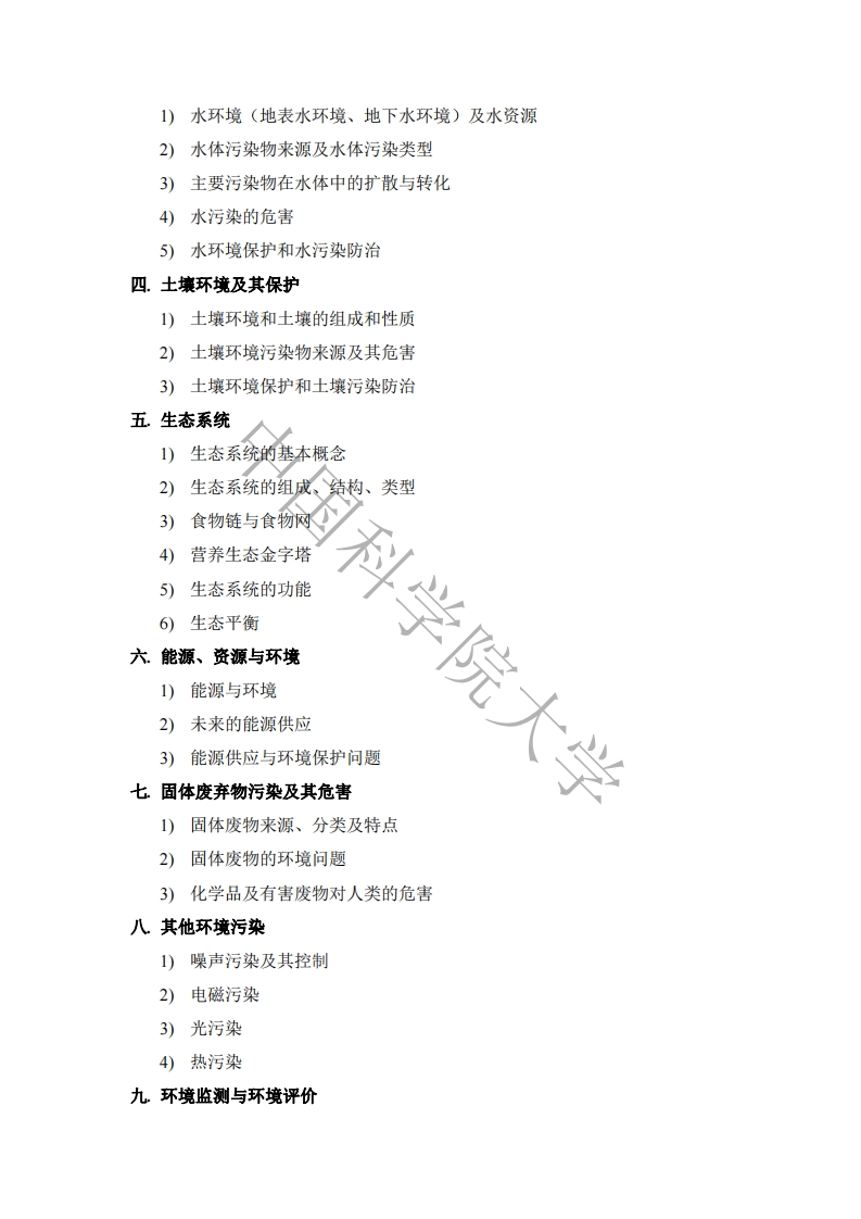 中国科学院大学硕士研究生入学考试《环境科学基础》考试大纲《环境科学基础》考试大纲适用于中国科学院大学环境科学、资源科学和自然地理学等相关专业的硕士研究生入学考试。《环境科学基础》是环境科学的入门课程,也是报考环境科学及相关学科的硕士生入学考试主要科目之一。主要内容包括全球性和区域性环境问题、环境污染与保护、环境污染的净化过程、当前人类所面临的可持续发展问题以及环境影响评价、环境规划和环境管理等。要求考生认识环境科学的性质、研究对象、主要内容和方法:系统掌握环境科学的基本概念、基本原理和基本方法:熟悉典型环境污染的生态效应,了解环境污染的基本净化过程与方法,并具有综合运用所学知识分析问题和解决问题的能力。考试形式闭卷,笔试,考试时间180分钟,人总分150分。试卷结构(题型):名词解释,简答题,论述考试内容一基本知识1)环境的概念、功能、属性与分类2)地球环境系统的组成及其相互关系院大学3)环境科学的形成与发展,以及研究对象和任务4)环境保护二.大气环境及其保护1)大气环境的结构和组成以及气象和气候灾害2)大气污染类型及主要污染物的来源和性质3)污染物在大气中的迁移转化及其影响因素4)大气污染的危害5)大气环境保护及措施三水环境及其保护