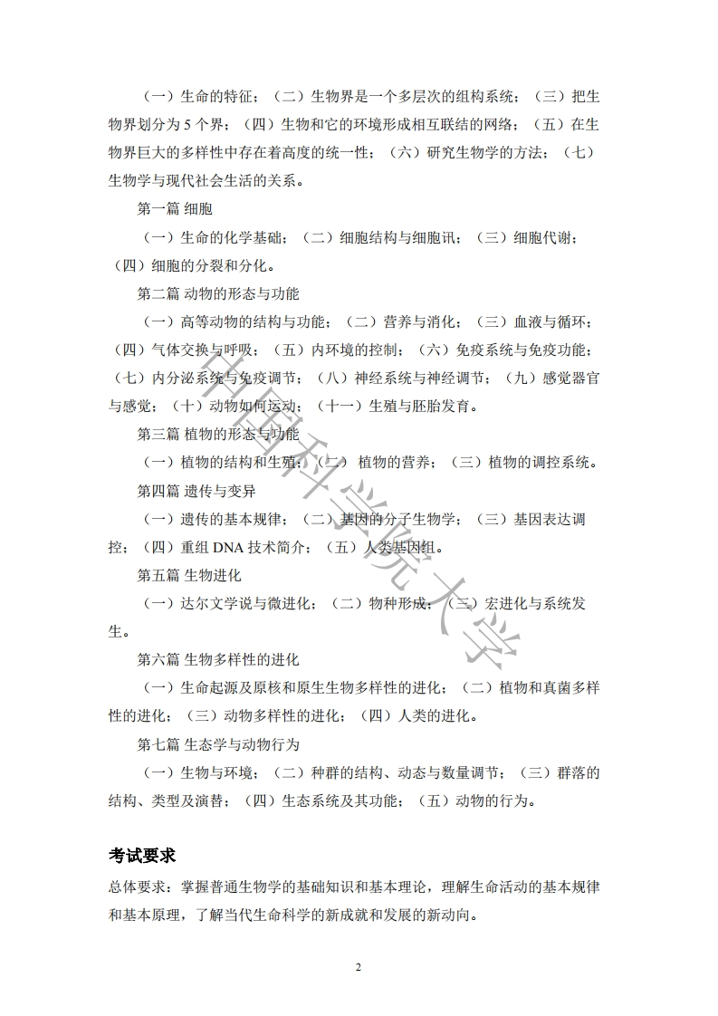 中国科学院大学硕士研究生入学考试《普通生物学》考试大纲考试科目基本要求及适用范围概述本《普通生物学》考试大纲适用于中国科学院大学生物学及相关专业的硕士研究生入学考试。普通生物学是一门具有通论性质的课程,又是生物学专业学生的一门基础课,它的任务是帮助学生了解生命科学的全貌和获得普遍的规律性的知识。生物界既有极大的多样性,又有高度的统一性。生物界是一个整体,生命科学内容美富多彩,是完整的、系统的知识体系。本考试大纲的主要内容涉及普通生物学的基本概念和原理,包括细胞、动物的形态与功能、植物的形态与功能、遗传与变异生物进化、生物多样性的进化及生态学与动物行为等。要求考生系统掌握普通生物学的基本概念、专业词语、技术原理,能应用普通生物学的知识和专业术语正确阐述基本的生命科学现象、概念、方法和原理。理解生物体的结构与功能、部分与整体及生物与环境的关系;并能运用所学的生物学知识解释和解决生物个体、环境和社会生活中的某些生物学问题。了解目前生命科学发展中的重大热点问题,及其对科学和社会发展的影响和意义。考试形式普通生物学考试为闭卷,笔试,考试时间180分钟,总分150分。试卷结构(题型)为:一、名词解释(12题,每题3分,共36分)二、选择题(15题,每题2分,共30分)三、填空题(24空,每空1分,共24分)四、问答题(任选6题,每题10分,共60分,多选者按前选计分)考试内容绪论:生物界与生物学