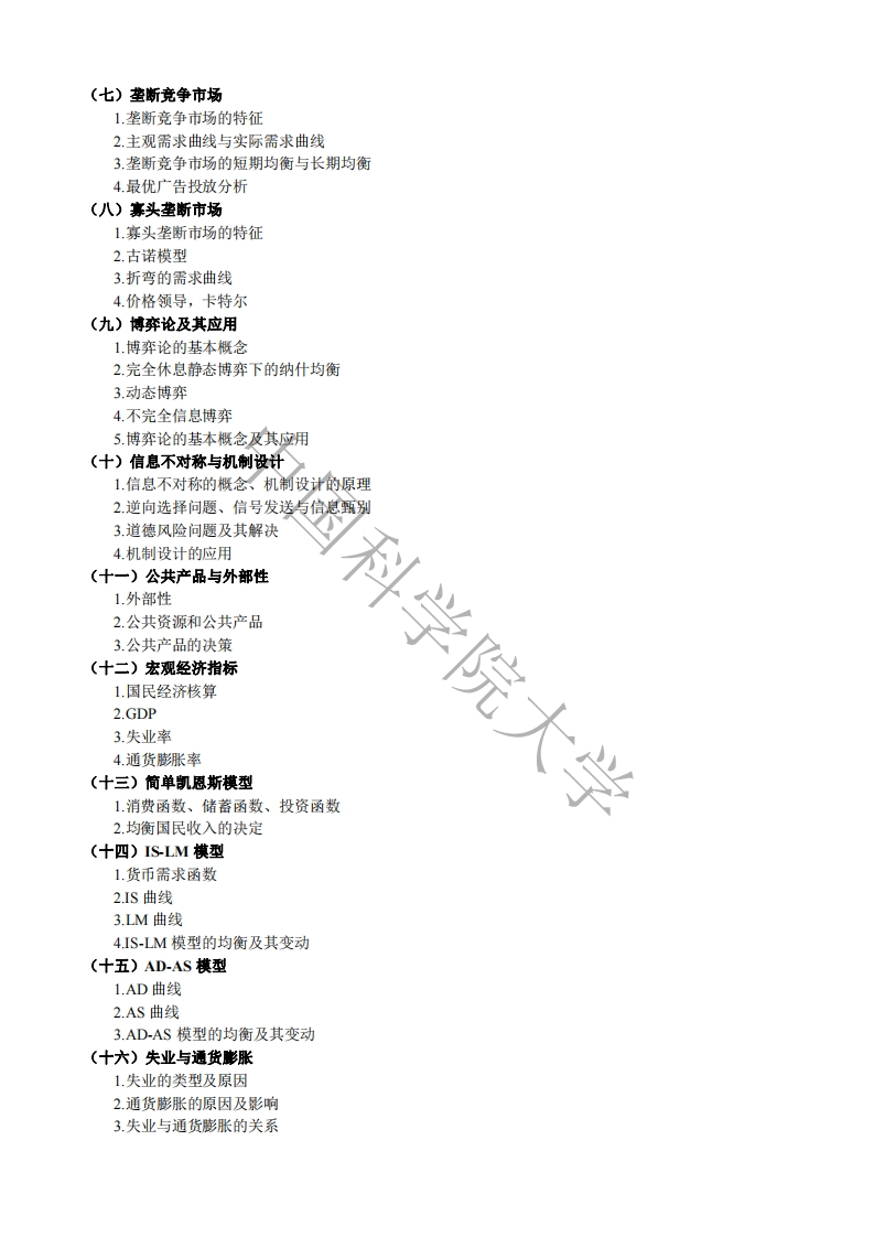 中国科学院大学硕士研究生入学考试《经济学》考试大纲本《经济学》考试大纲适用于中国科学院大学硕士研究生入学考试。经济学是社会科学的重要组成部分,是多个学科专业的基础理论课程。本课程要求学生在熟练掌握一系列基本概念、图形分析和数学模型的基础上,能够对市场经济的运行机制有全面系统的了解,能够具有经济学思维,运用经济学的观点、原理和工具分析实际问题。一、考试内容(一)需求、供给与市场均衡1需求与需求函数,需求定律,需求量的变化与需求的变化2.供给与供给函数,供给量的变化与供给的变化3弹性的定义,点弹性,弧弹性,弹性的几何表示4.需求价格弹性、需求收入弹性、需求交叉弹性5.市场均衡的形成与调整,市场机制的作用6.需求价格弹性与收益、蛛网模型(二)消费者行为理论1效用的含义,基数效用论和序数效用论,效用的基本假定2.总效用与边际效用,边际效用递减规律3无差异曲线、预算线与消费者均衡J4替代效应与收入效应,希克斯方法与斯卢斯基方法,吉芬商品(三)生产理论1.生产函数,短期与长期,边际报酬递减法则2.总产品、平均产品与边际产品,生产的三阶段论3等产量线、等成本线与生产者均衡,生产的经济区4.柯布一道格拉斯生产函数、CES生产函数(四)成本理论1.会计成本与经济成本,会计利润与经济利润2.短期成本函数与短期成本曲线族3.长期成本函数与长期成本曲线,规模经济与规模不经济,规模报酬的测度与变化规律4长期成本曲线与短期成本曲线的关系,成本曲线与生产函数的关系(五)完全竞争市场1.完全竞争市场的特征2.完全竞争市场的短期均衡与长期均衡3.完全竞争市场与帕累托最优4.消费者剩余,生产者剩余和管制的福利分析(六)完全垄断市场1.完全垄断市场的特征,垄断的成因2.完全垄断厂商所面临的需求曲线与平均收入线、边际收入线3.完全垄断市场的均衡4.完全垄断市场的评价5垄断者的定价策略,包括价格分歧、两步收费和搭售6.反垄断的原理与争议7.平台经济与平台经济反垄断