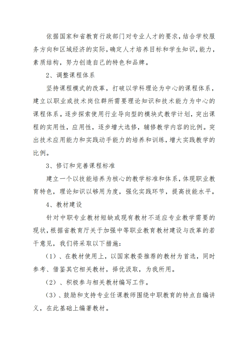 2024年文化艺术系专业建设实施计划根据教育部提出的“以教育思想观念改革为先导,以教学改革为核心,以教学基本建设为重点,注重提高教育质量,努力办出特色”的基本工作思路作为指导思想。以“三个面向”为指导,突出“质量、特色、水平”,借鉴高等院校成功的办学经验,更新观念,勇于创新,大胆改变传统的教学体系和教学方法,规范课程设置,丰富教学内容,改进教学手段,注重教学实践,努力建立新的教学模式和人才培养模式。为实现文化艺术系专业人才培养目标,特制订此工作计划。一、基本思路1、组织由专业指导委员会成员参加的专业设置论证,在深入细致的市场调研基础上,进一步明确专业的发展方向,为特定岗位培养合格人才,充分体现职业教育的特色。2、以实际应用能力和基本素质培养为主线,构建学生的知识、能力和素质结构,制订专业培养目标、能力要求、课程设置和教学计划。并建立与专业培养目标相适应的理论教学体系和实践教学体系。3、加强校内实验室和校外实习、实训基地建设,坚持“产学研”相结合。二、专业建设实施方案1、修订和完善教学计划