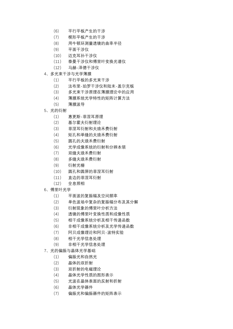 2023年面向香港、澳门、台湾地区招收博士研究生光电工程与应用专业课考试科目名称及大纲一、专业课科目名称物理光学二、参考书目《物理光学》(第5版)梁铨廷著,电子工业出版社,ISBN:9787121204418,2018年4月。三、考试大纲《物理光学》考试大纲一、考试基本要求要求考生全面系统地掌握经典与现代物理光学的基本概念、原理,主要现象和重要应用等内容。二、考试内容1、光的电磁理论(1)光的电磁波性质(2)平面电磁波(3)球面波和柱面波(4)光源和光的辐射(5)电磁场的边值关系(6)光在两介质分界面上的反射和折射(7)全反射(8)光波在金属表面的透射和反射(9)光的吸收、色散和散射2、光波的叠加与分析(1)两个频率相同、振动方向相同的单色光波的叠加(2)驻波(3)两个频率相同、振动方向互相垂直的光波的叠加(4)不同频率的两个单色光波的叠加(5)光波的分析3、光的干涉和干涉仪(1)实际光波的干涉及实现方法(2)杨氏干涉实验(3)分波前干涉的其他实验装置(4)条纹的对比度(5)相干性理论