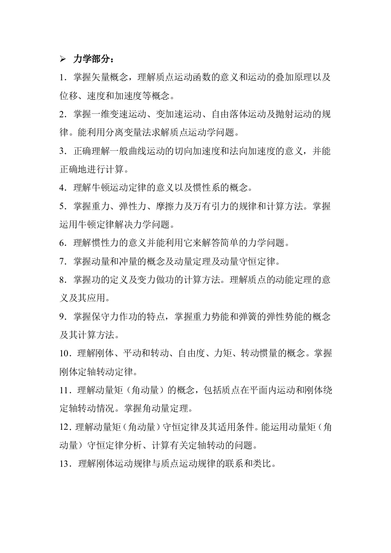 一、专业课科目名称普通物理二、参考书目《普通物理学》(第七版)程守洙、江之勇等编著,高等教育出版社,2016年5月.三、考试大纲《普通物理》考试大纲(一)考试基本要求:《普通物理》主要目的是考查考生对力学、热学、电磁学、光学和狭义相对论及量子力学共五个部分中各项内容的理解和掌握的程度。对各部分知识内容要求掌握的程度,可分两个层面:第一层面为“理解”;第二层面为“掌握”。其中“理解”的含义为:对所列知识能在有关问题中识别和直接使用;而“掌握”的含义为:对所列知识除了要理解其确切含义及与其他知识的联系外,还能够在实际问题的分析、综合、推理和判断等过程中运用。本专业方向要求考生比较全面系统的理解和掌握相关基本概念、原理、定律和实验方法,并能够综合运用所学知识分析和解决一定难度的实际问题。(二)考试内容: