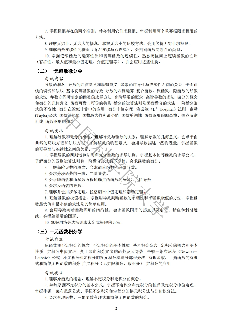 中国科学院大学硕士研究生入学考试高等数学(乙)考试大纲一、考试性质中国科学院大学硕士研究生入学高等数学(乙)考试是为招收理学非数学专业硕士研究生而设置的选拔考试。它的主要目的是测试考生的数学素质,包括对高等数学各项内容的掌握程度和应用相关知识解决问题的能力。考试对象为参加全国硕士研究生入学考试、并报考大气物理学与大气环境、气象学、天文技术与方法、地球流体力学、固体地球物理学、矿物学、岩石学、矿床学、构造地质学、第四纪地质学、地图学与地理信息系统、自然地理学、人文地理学、古生物学与地层学、生物物理学、生物化学与分子生物学、物理化学、无机化学、分析化学、高分子化学与物理、地球化学、海洋化学、海洋生物学、植物学、生态学、环境科学、环境工程、土壤学等专业的考生。二、考试的基本要求要求考生比较系统地理解高等数学的基本概念和基本理论,掌握高等数学的基本方法。要求考生具有抽象思维能力逻辑推理能力、空间想象能力、数学运算能力和综合运用所学的知识分析问题和解决问题的能力。三、考试方式和考试时间高等数学(乙)考试采用闭卷笔试形式,试卷满分为150分,考试时间为180分钟.四、考试内容和考试要求(一)函数、极限、连续考试内容函数的概念及表示法函数的有界性、单调性、周期性和奇偶性复合函数、反函数、分段函数和隐函数基本初等函数的性质及其图形数列极限与函数极限的概念无穷小和无穷大的概念及其关系无穷小的性质及无穷小的比较极限的四则运算极限存在的单调有界准则和夹逼准则两个重要极限:1 lim sinx-l,lim(l+马'=e→动1函数连续的概念函数间断点的类型初等函数的连续性闭区间上连续函数的性质函数的一致连续性概念考试要求1.理解函数的概念,掌握函数的表示法,并会建立简单应用问题中的函数关系式。2.理解函数的有界性、单调性、周期性和奇偶性。掌握判断函数这些性质的方法。3.理解复合函数的概念,了解反函数及隐函数的概念。会求给定函数的复合函数和反函数。4.掌握基本初等函数的性质及其图形。5.理解极限的概念,理解函数左极限与右极限的概念,以及函数极限存在与左、右极限之间的关系。6.掌握极限的性质及四则运算法则,会运用它们进行一些基本的判断和计算。