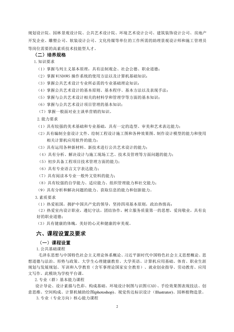 公共艺术设计专业人才培养方案一、专业名称及代码专业名称:公共艺术设计专业代码:550108二、入学要求高中阶段教育毕业生或具有同等学历者三、修业年限基本三年,最长五年四、职业面向本专业所属文化艺术大类(代码55)就业岗位就业范围具体工作任务与专业相关的职业技能等级证书例举建筑装饰设计公司、房地产开发企业、建筑装能够识读施工图,并利用CAD设计绘图岗位饰施工企业、景观设计软件对施工图进行深化设计。公司、规划设计院建筑装饰设计公司、房地产开发企业、景观设图纸绘制、三维模型制作、材效果图制作员计公司、规划设计院、质灯光制作、三维动画制作、雕塑公司、软装设计公特技效果制作。司在主管设计师的领导下完善建筑装饰设计公司、房助理景观设计师(国家职业资格三级)地产开发企业、景观设与细化项目设计方案,编制全设计岗位计公司、规划设计院、套设计文件、绘制工程设计施雕塑公司、软装设计公工图和各种效果图、制作设计司、文化传媒公司模型。在项目经理的领导下对整个建筑装饰设计公司、建项目装饰各阶段施工活动实施工员筑装饰施工企业、景观设计公司、雕塑公司施组织管理,按施工进度计划实施各部分的装饰施工五、培养目标与培养规格(一)培养目标本专业方向培养具有综合艺术设计创新能力、审美能力、动手制作能力的实用型艺术设计人才,学握公共艺术设计领域的相关知识和技能,课程设置与时代发展需求紧密结合,要求学生具备国际视野和跨界协作能力,能够胜任公共艺术设计解决方案和掌控公共艺术创作的全部过程。面向广东珠江三角洲地区城市景观设计和创意文化产业,毕业后能够胜任公共艺术设计工作,能够从事城市