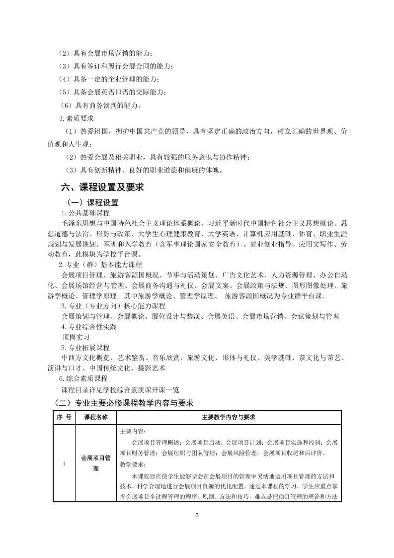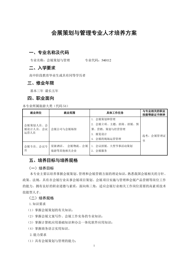 会展策划与管理专业人才培养方案一、专业名称及代码专业名称:会展策划与管理专业代码:540112二、入学要求高中阶段教育毕业生或具有同等学历者三、修业年限基本三年最长五年四、职业面向本专业所属旅游大类(代码54)就业岗位就业范围具体工作任务与专业相关的职业技能等级证书例举1.会展策划和管理会展策划人员、会2.会展立项、主趣、招商、招展、预展设计人员、会议会展公司与会展场馆算、营销、策划与经营管理运营人员3.展览设计选考:会展管理证4.会展的现场运营管理书会展专员、会议专星级酒店、会展物流、会展1.会议招展、大型节事活动策划丹旅游等其他相关企业2.会展服务五、培养目标与培养规格(一)培养目标本专业主要以培养掌握会展策划、管理和会展营销方面的理论知识,熟悉我国会展相关的方针、政策、法规,具有在会展行业从事会展项目策划、会展项目实施与管理和会展产品营销等岗位工作的能力,拥有良好的职业道德与素质,面向珠三角,适应会展行业相关工作岗位需要的高素质技术技能型人才。(二)培养规格1.知识要求(1)掌握会展策划的有关知识:(2)掌握会展文案写作、会展工作实务的专业知识:(3)掌握计算机应用基础知识和办公一体化软件应用知识:(4)掌握商务语言实用知识2.能力要求(1)具有会展策划与管理的能力: