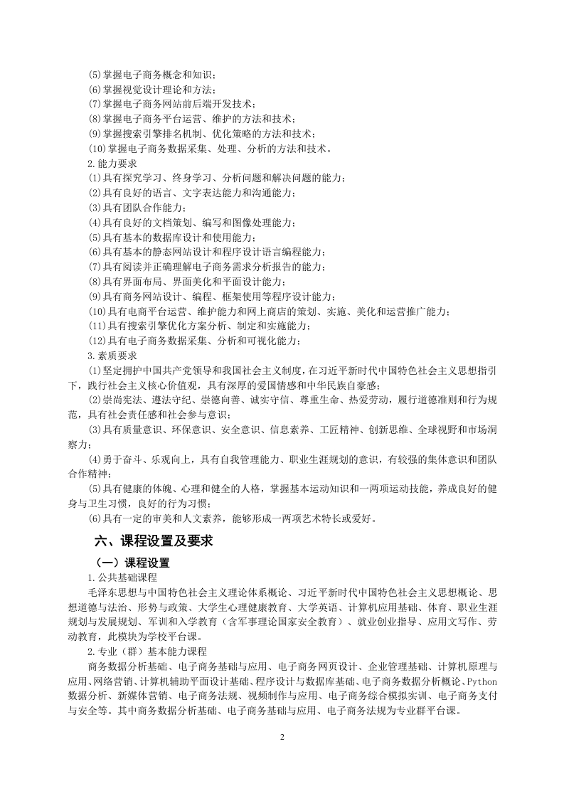 计算机应用技术专业人才培养方案一、专业名称及代码专业名称:计算机应用技术专业代码:510201二、入学要求普通高级中学毕业、中等职业学校毕业或具备同等学力三、修业年限基本三年四、职业面向本专业属电子与信息专业大类(代码51)。就业岗位就业范围具体工作任务与专业相关的职业技能等级证书例举电子商务网站开发电子商务网站规划、网络编程、数据库建设限考:(前端/后端)面向与计算程序设计、站点管理与技术维护等工作电子商务技术员机应用相关负责网站页面的功能架构设计与布局,以及页电子商务设计师网页设计师的各行政事面设计美化等工作。程序员业单位及互负责移动客户端相关产品的设计及开发工作、软件设计师移动开发联网、电信、移动端UI展现设计、ios/android上的性能调网页制作员零售、金融、Adobe网页设计师制造、物流优等工作。电商类平台运营教育等众多管理和维护电子商务网站以及根据需求完成网站信息的更新和信息资源的整合。行业商务数据分析商务数据采集、处理、分析五、培养目标与培养规格(一)培养目标本专业培养理想信念坚定,德、智、体、美、劳全面发展,具有一定的科学文化水平,良好的人文素养、职业道德和创新意识,精益求精的工匠精神,较强的就业能力和可持续发展的能力:掌握本专业知识和技术技能,面向软件和信息技术服务行业的电子商务师、计算机程序设计员等职业群,能够从事电子商务网站开发(前端/后端)、新媒体运营、移动开发、电子商务平台运营、电子商务数据分析工作的高素质技术技能人才。(二)培养规格本专业毕业生应在素质、知识和能力方面达到以下要求。1.知识要求(1)掌握必备的思想政治理论、科学文化基础知识和中华优秀传统文化知识:(2)熟悉与本专业相关的法律法规以及环境保护、安全消防、文明生产、支付与安全等相关知识:(3)掌握程序设计理论知识:(4)掌握数据库设计、管理和数据操作知识: