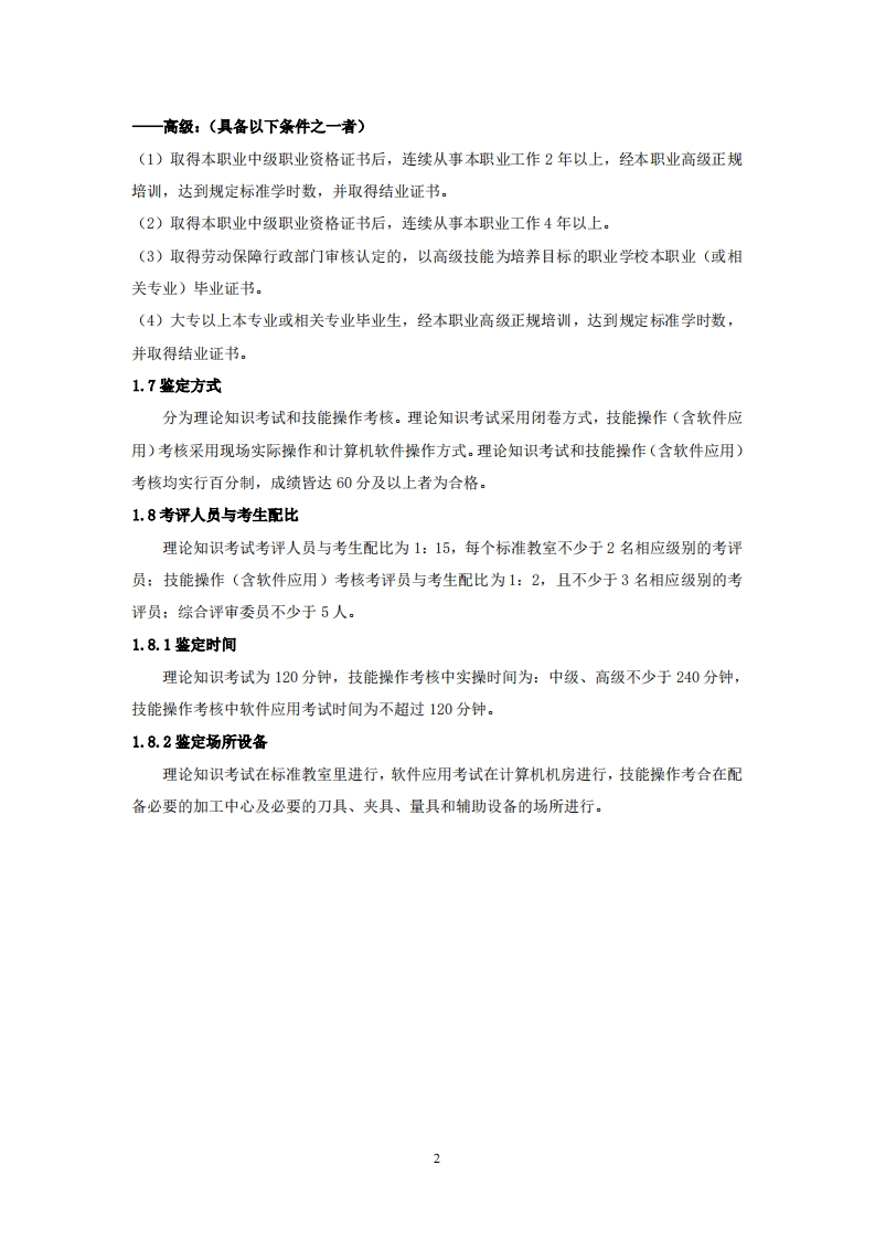 加工中心操作工职业技能鉴定考核大纲1.职业概况1.1职业名称加工中心操作工。1.2职业定义从事编制数控加工程序并操作加工中心机床进行零件多工序组合切削加工的人员。1.3职业等级本职业共设两个等级,分别为:中级(国家职业资格四级)、高级(国家职业资格三级)。1.4基本文化程度高中毕业(或同等学历)。1.5培训要求1.5.1培训期限全日制职业学校教育,根据其培养目标和教学计划确定。晋级培训期限:中级不少于400标准学时:高级不少于300标准学时。1.5.2培训救师培训中、高级人员的教师应取得本职业技师及以上职业资格证书或相关专业中级及以上专业技术职称任职资格。1.5.3培训场地设备满足教学要求的标准教室、计算机机房及配套的软件、加工中心及必要的刀具、夹具、量具和辅助设备等。1.6鉴定要求1.6.1适用对象从事或准备从事本职业的人员。1.6.2申报条件一中级:(具备以下条件之一者)(1)经本职业中级正规培训达规定标准学时数,并取得结业证书。(2)连续从事本职业工作5年以上。(3)取得经劳动保障行政部门审核认定的,以中级技能为培养目标的中等以上职业学校本职业(或相关专业)毕业证书。(4)取得相关职业中级《职业资格证书》后,连续从事本职业2年以上。经本职业中级正规培训,达到规定标准学时数,并取得结业证书。