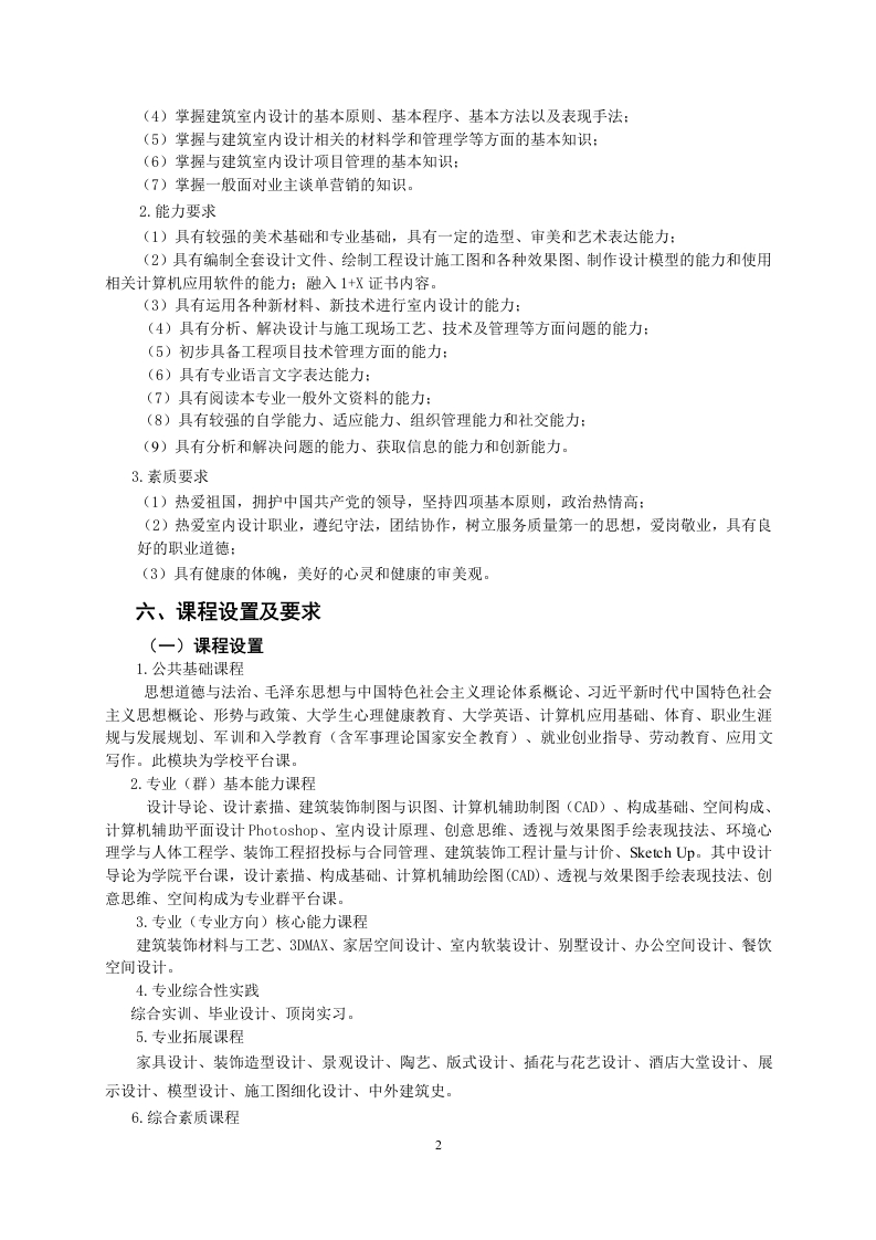 建筑室内设计专业人才培养方案一、专业名称及代码专业名称:建筑室内设计专业代码:440106二、入学要求高中阶段教育毕业生或具有同等学历者三、修业年限基本三年,最长五年四、职业面向本专业所属土木建筑大类(代码44)。就业岗位就业范围具体工作任务与专业相关的职业技能等级证书例举建筑装饰设计公司、设计院、能够识读建筑装饰施工图,并利用CAD设计员房地产开发企业、建筑装饰施软件对装饰施工图进行深化设计工企业限考:室内设计职建筑装饰设计公司、设计院、在项目经理的领导下对整个项目装饰业技能等级证书施工员房地产开发企业、建筑装饰施各阶段施工活动实施组织管理,按施工1+X证书工企业进度计划实施各部分的装饰施工。选考:室内装饰设根据装饰工程的施工进度计划,编制工计员(国家职业资建筑装饰设计公司、设计院、程各阶段材料供应计划:根据工程进度格三级)材料员房地产开发企业、建筑装饰施及市场情况,按计划进行材料采购:掌工企业握现场的工程变更情况,获取准确实物量,控制材料质量和用量。五、培养目标与培养规格(一)培养目标本专业培养掌握新的设计理念和建筑室内设计基础理论,融入1+X证书内容,具有一定的建筑室内设计能力、审美能力、动手制作能力和较强的实践应用能力,并拥有良好的专业修养和爱岗敬业的职业素质,面向广东珠江三角洲地区城市建筑室内装饰设计产业和创意文化产业,适应建筑室内设计行业所需的室内外建筑装饰装修设计以及工程造价、施工管理、质量控制等岗位需要的高素质技术技能型人才。(二)培养规格1.知识要求(1)掌握马列主义基本原理,具有法制观念、社会公德、职业道德:(2)掌握WINDOWS操作系统的使用方法以及计算机基础知识:(3)掌握建筑室内设计与工程管理专业所必需的专业基础理论知识: