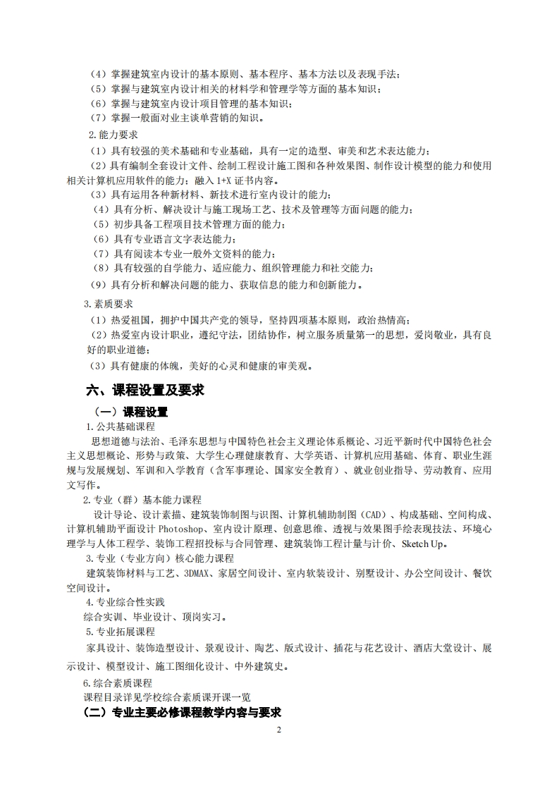 建筑室内设计专业人才培养方案一、专业名称及代码专业名称:建筑室内设计专业代码:440106二、入学要求高中阶段教育毕业生或具有同等学历者三、修业年限基本三年,最长五年四、职业面向本专业所属土木建筑大类(代码44)。就业岗位就业范四具体工作任务与专业相关的职业技能等级证书例举建筑装饰设计公司、设计院、能够识读建筑装饰施工图,并利用CD设计员房地产开发企业、建筑装饰施软件对装饰施工图进行深化设计。工企业限考:室内设计职建筑装饰设计公司、设计院、在项目经理的领导下对整个项目装饰业技能等级证书施工员房地产开发企业、建筑装饰施各阶段施工活动实施组织管理,按施工1+X证书工企业进度计划实施各部分的装饰施工。选考:室内装饰设根据装饰工程的施工进度计划,编制工计员(国家职业资建筑装饰设计公司、设计院、程各阶段材料供应计划:根据工程进度格三级)材料员房地产开发企业、建筑装饰施及市场情况,按计划进行材料采购:掌工企业握现场的工程变更情况,获取准确实物量,控制材料质量和用量。五、培养目标与培养规格(一)培养目标本专业培养掌握新的设计理念和建筑室内设计基础理论,融入1+X证书内容,具有一定的建筑室内设计能力、审美能力、动手制作能力和较强的实践应用能力,并拥有良好的专业修养和爱岗敬业的职业素质,面向广东珠江三角洲地区城市建筑室内装饰设计产业和创意文化产业,适应建筑室内设计行业所需的室内外建筑装饰装修设计以及工程造价、施工管理、质量控制等岗位需要的高素质技术技能型人才。(二)培养规格1.知识要求(1)掌握马列主义基本原理,具有法制观念、社会公德、职业道德:(2)掌握WINDOWS操作系统的使用方法以及计算机基础知识:(3)掌握建筑室内设计与工程管理专业所必需的专业基础理论知识:1
