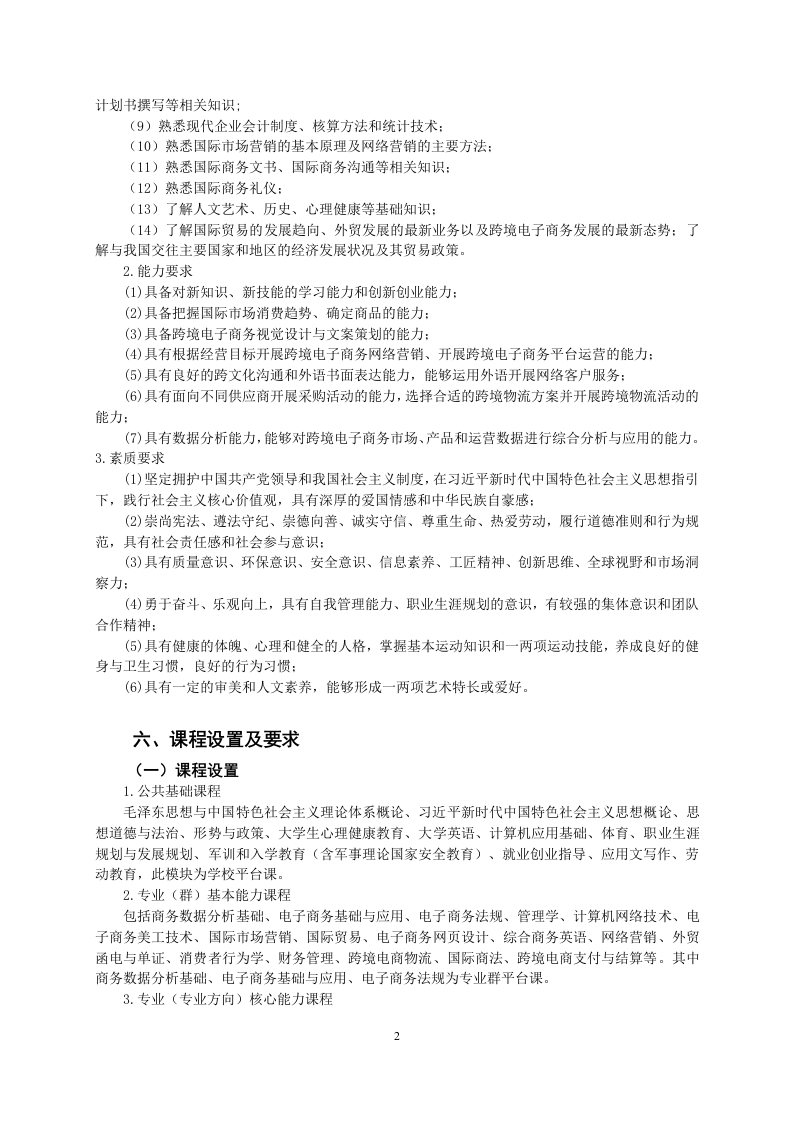 跨境电子商务专业人才培养方案一、专业名称及代码专业名称:跨境电子商务专业代码:530702二、入学要求高中阶段教育毕业生或具有同等学历者三、修业年限基本三年,最长五年四、职业面向本专业属财经商贸专业大类(代码53)。就业岗位就业范围具体工作任务与专业相关的职业技能等级证书例举限选:1+X跨境电商B2B数跨境营销推广、跨跨境电子高务平台运营、视觉设计、跨境电子境客户服务、跨境据运营技能证书跨境电子商商务网络营销与活动策划、跨境电子商务客户选考:物流操作、关务处务应用企业服务、国际物流与供应链管理、国际市场推广1+X电子商务数据分理、跨境运营等工作析1+X网店运营推广五、培养目标与培养规格(一)培养目标本专业培养德、智、体、美、劳全面发展,具有良好职业道德和人文素养,掌握跨境电子商务领域相关专业理论知识,具备跨境电子商务网络营销、活动策划、平台运营等能力,从事跨境电子商务平台运营及数据分析、视觉营销、网络客服等工作的高素质技术技能人才。(二)培养规格本专业毕业生应在素质、知识和能力方面达到以下要求。1.知识要求(1)掌握必备的思想政治理论、科学文化基础知识和中华优秀传统文化知识:(2)熟悉与本专业相关的法律法规以及环境保护、安全消防、支付与安全等相关知识:(3)掌握本专业所必需的应用文写作、经济数学、商务外语(以英语为主)、计算机及互联网等基础知识:掌握英语听、说、读、写、译的基本方法:(4)掌握与国际商务(跨境电商)专业相关的经济、管理知识:(5)掌握进出口业务、外贸单证、外贸英文函电等基础专业知识:(6)掌握从事对外贸易活动的国际贸易惯例、法律和公约等知识:外贸风险的种类及外贸风险管理的相关知识(7)掌握开展跨境电商业务活动必需的信息技术知识:(8)掌握创业机会的寻找与评估、创业环境分析、创业团队组建、创业融资渠道与方式、创业