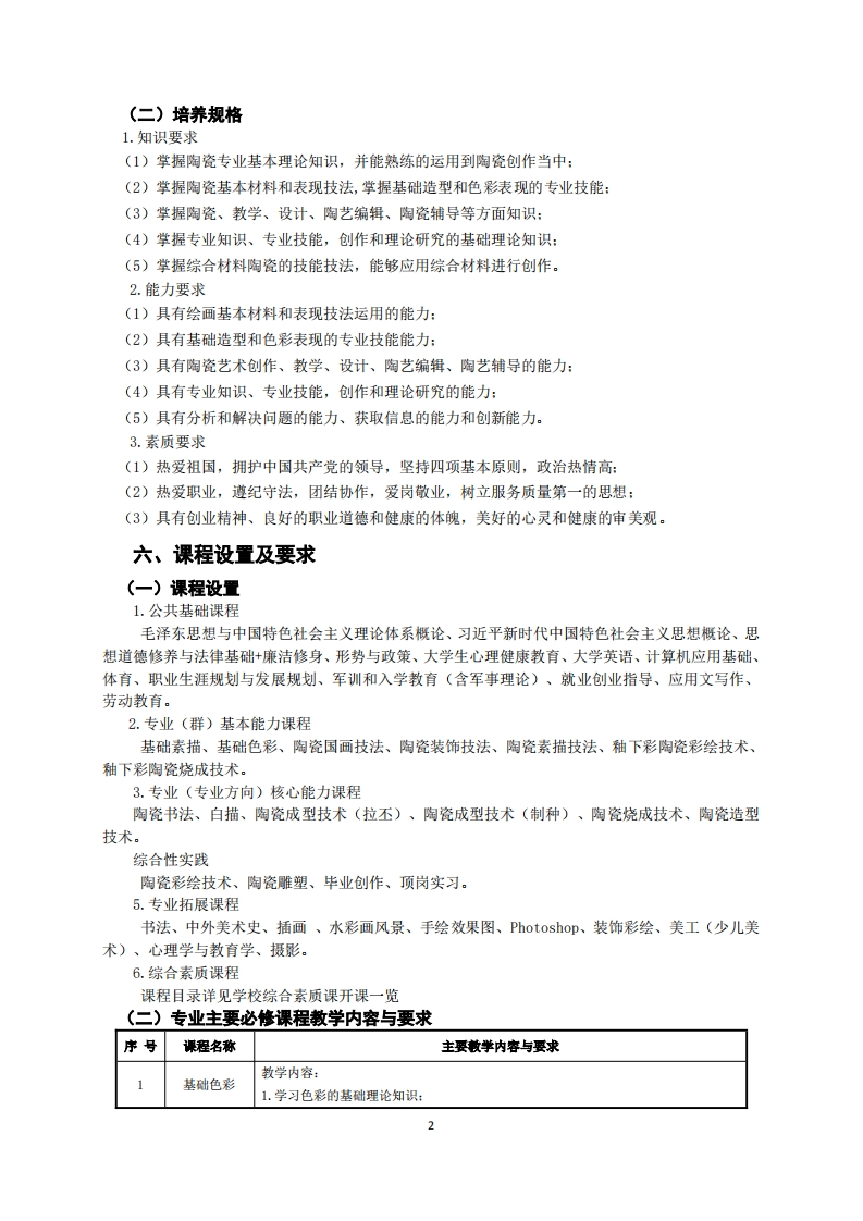 陶瓷设计与工艺人才培养方案一、专业名称及代码专业名称:陶瓷设计与工艺专业代码:550122二、入学要求高中阶段教育毕业生或具有同等学历者三、修业年限基本三年,最长五年四、职业面向本专业所属文化艺术大类(代码55)。就业岗位就业范围具体工作任务与专业相关的职业技能等级证书例举能够将自己的专业知识系统的传授给陶艺教师学生,并能够结合教学把自己陶宇创作中小学、培训机构等的技法感想等以理论研究性论文进行发表。能够参与各类陶艺创作为主的工作,并把自己陶艺作品送往各大艺术展览,定时举办个人艺术展。陶艺家自由职业在各级艺术馆、展览馆、文化馆(站)陶瓷工艺师证、初从事陶艺创作和辅导工作,在出版社、级职业资格证、教报刊杂志社从事陶艺编辑工作。师资格证、幼师证、有较高的艺术修养和较强的造型能力,陶艺设计师陶瓷公司具有独立完成创作的能力运用专业知陶瓷烧成识完成公司陶瓷相关项目任务。根据客户需求,完成对设计方案制作及陶瓷公司效果图的制作,能够表达设计意图陶瓷美术设计企事业单位宣传部门等有较高的艺术修养和较强的造型能力,具有独立完成创作能力。五、培养目标与培养规格(一)培养目标本专业主要培养掌握较新创作理念和具备陶瓷艺术学科基础理论知识,具有一定的创新能力、陶瓷制作能力、教学能力和较强的实践应用能力,并拥有良好的陶瓷艺术修养和爱岗敬业的职业素质,面向广东珠江三角洲地区文化艺术部门、学校、科研单位、设计公司,适应中小学及培训机构陶艺教师、陶艺家等岗位需要的高素质技术技能型人才。