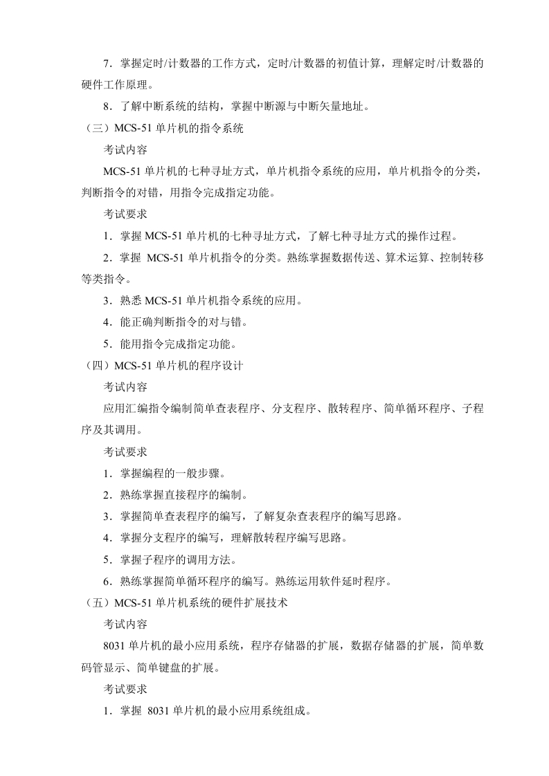 中国地质大学研究生院硕士研究生同等学力加试科目《单片机原理及应用》考试大纲一、试卷结构问答题约10%填空题、选择题、判断题约40%汇编语言编程题约20%单片机接口硬件约15%单片机的应用约15%二、考试内容及要求(一)单片机基础知识考试内容单片机的特点、应用范围以及单片机的发展趋势考试要求1.了解单片机的发展过程。2.清楚单片机的特点,单片机的应用范围。3.了解单片机的发展趋势。(二)MCS-51单片机的硬件及工作原理考试内容MCS-51单片机的内结构、特点,单片机的基本时序单位:MCS-51单片机存储器的地址空间划分,单片机的片外三总线,并行I/O口P0-P3的功能:定时/计数器的工作方式,定时计数器的初值计算:中断源与中断矢量地址。考试要求1.掌握MCS-51单片机的内部结构摸块。2.清楚MCS-51单片机的结构特点。3.了解MCS-51单片机的引脚分布。4.了解MCS-51单片机的基本时序单位,弄清其机器周期,指令周期。5.了解MCS-51单片机存储器的组织,存储空间划分。6.掌握并行I/O口P0-P3的功能,了解P0-P3口的位结构。