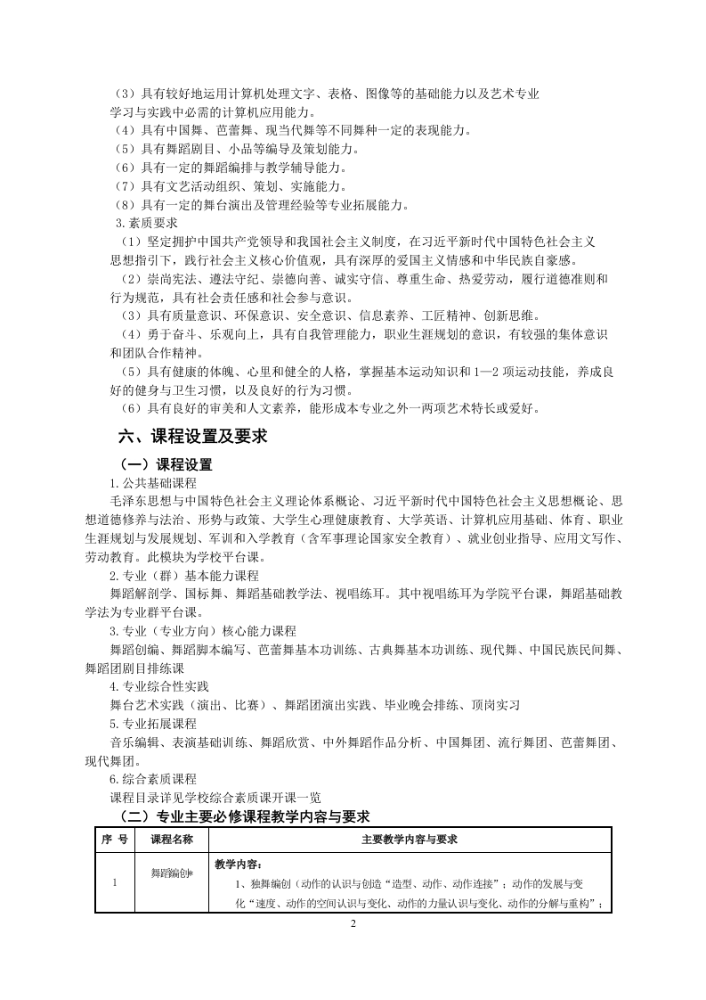 舞蹈编导专业人才培养方案一、专业名称及代码专业名称:舞蹈编导专业代码:550215二、入学要求高中阶段教育毕业生或具有同等学历者三、修业年限基本三年,最长五年四、职业面向本专业所属文化艺术大类(代码55)。就业岗位就业范围具体工作任务与专业相关的职业技能等级证书例举舞蹈编导从事舞蹈编创、群文工作从事舞蹈编创工作中国舞蹈家协会从事舞蹈的教育教学及培训《中国舞蹈考级》舞蹈教师从事舞蹈的教育教学及培训工作工作师资证书五、培养目标与培养规格(一)培养目标本专业培养理想坚定,热爱中国共产党,热爱社会主义祖国,拥护党的领导、拥护社会主义制度,适应社会主义现代化建设需要,德、智、体、美全面发展,具有一定的科学文化水平,良好的人文素养、职业道德、创新意识和精益求精的工匠精神以及较强的就业、可持续发展的能力。最终能在群众文化艺术部门、各级各类学校、舞蹈艺术培训中心、厂矿企业部门、民俗村及旅游景点、表演团体等,从事舞蹈编导、艺术辅导、社会培训、群众文化服务及相关工作的高素质技术技能型人才。(二)培养规格1.知识要求(1)掌握必备的思想政治理论、科学文化基础知识和中华优秀传统文化知识。(2)熟悉与本专业相关的法律法规以及环境保护、安全消防等知识。(3)掌握基本的舞蹈编导编创的理论知识和方法。(4)熟悉中外舞蹈作品以及分析的基本理论和方法。(5)掌握舞蹈编创素材收集、积累的基本理论和方法。(6)掌握舞蹈编导及教学的基本规律。(7)熟悉文艺活动策划组织指导的基本方法。(8)了解艺术学及其他艺术门类基础知识。2.能力要求(1)具有探究学习、终身学习、分析问题和解决问题的能力。(2)具有良好的语言、文字表达能力和沟通能力。