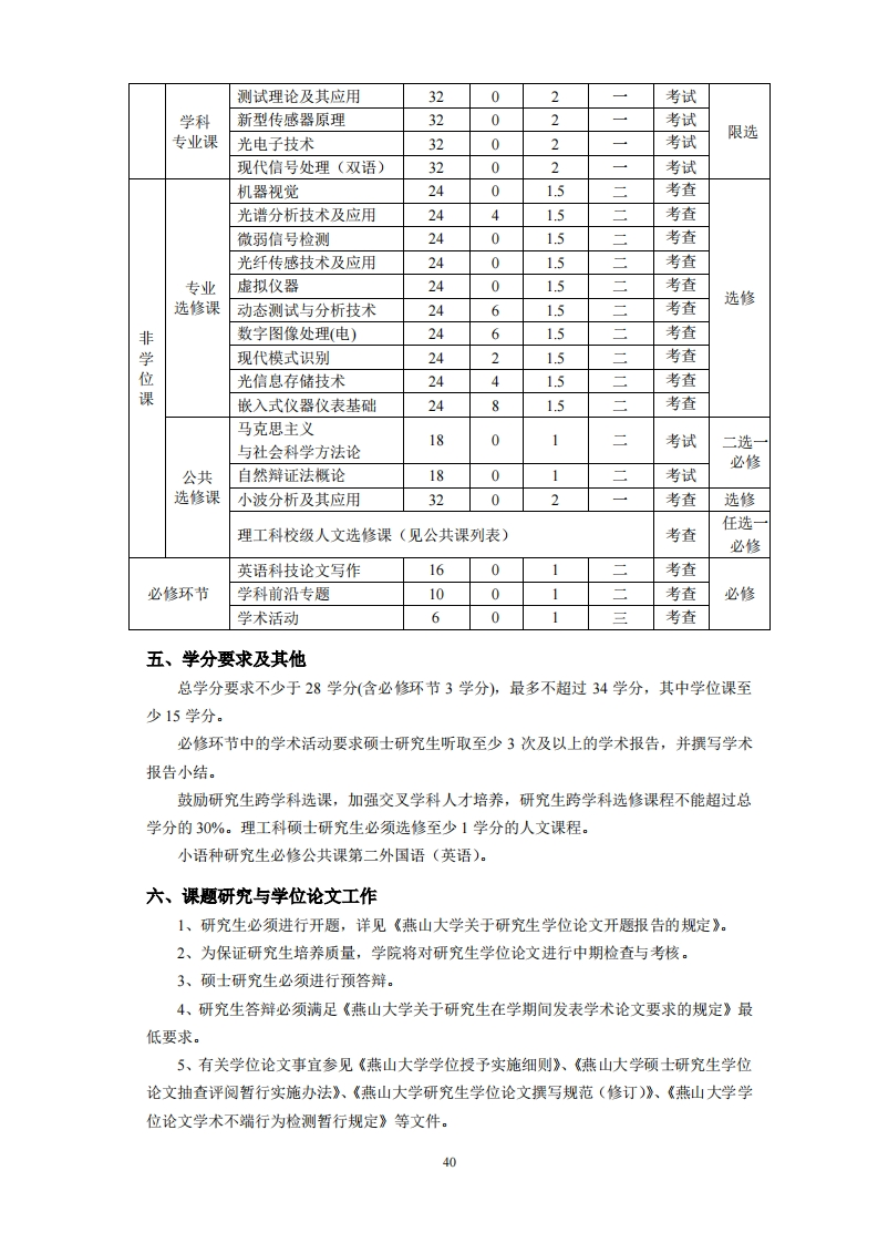 仪器科学与技术(0804)硕士研究生培养方案一、培养目标培养适应国家和地方社会发展需要的德、智、体、美全面发展的高素质创造性人才。具体要求:1、树立爱国主义和集体主义思想,掌握马克思主义基本原理,树拉科学的世界观与方法论。2、掌握本学科领域较坚实的基础理论和较宽广的专门知识,掌握现代实验方法和技能,具有从事科学研究或担负专门技术工作的能力。3、应较熟练地掌握一门外国语,可阅读本专业的外文资料。4、具有良好的团队合作精神。5、具有健康的体魄和良好的心理素质。二、学科简介和研究方向学科简介:仪器科学与技术是光学、机械、计算机、信总、控制等多学科互相渗透而形成的一门高新技术密集型综合学科。主要研究测量理论和测量方法、各种类型测量仪器、测控系统的工作原理、设计方法和应用技术。学科拥有仪器科学与技术一级学科博士点和硕士点,下设2个二级学科硕士点:精密仪器及机械、测试计量技术及仪器。现有仪器科学与技术博士后流动站,测试计量技术及仪器河北省重点学科及重点实验室。本学科现有教授7人(其中博士生导师4人),副教授7人,具有博士学位教师占95%。研究方向:1、光电检测与光纤传感技术2、精密测试及机械故障诊断技术3、计算机视觉测量4、光子技术与光传感5、工程信号检测与分析6、工业过程先进测控与节能环保技术7、环境监测技术8、现代光学信息处理三、学制、在学年限及培养方式全日制硕士研究生学制为2.5年,实行2~4年弹性培养。提前、延期毕业按《关于全日制研究生最短答辩时限的决定》(燕大校字〔2006)79号)、《燕山大学硕士研究生提前毕业暂行规定》(燕大校字〔2007)179号)、《燕山大学研究生学籍管理实施细则(试行)》(2005年9月)等文件规定办理。硕士研究生的培养,实行以科学与工程技术研究为主导的导师负责制,也可以导师集体指导的方式进行。四、课程设置及必修环节类别课程名称学时学分开课考核总学时实验时间方式备注第一外国语8003一、二考试学公共中国特色社会主义理论必修位学位课与实践教学3602考试课学科矩阵分析322考试基础课必修随机过程3202考试39