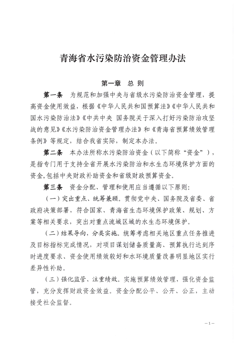 QHFS102024—0008青海省财政厅文件青海省生态环境厅青财资环字〔2024)481号青海省财政厅青海省生态环境厅关于印发《青海省水污染防治资金管理办法》的通知各市(州)财政局、生态环境局:为规范和加强中央与省级水污染防治资金管理,提高资金使用效益,根据财政部《水污染防治资金管理办法》(财资环〔2021〕36号)等文件规定,结合我省水生态环境保护工作实际,我们制定了《青海省水污染防治资金管理办法》,现予印发,请遵照执行。生态背省生态环境2024年5月010102s19