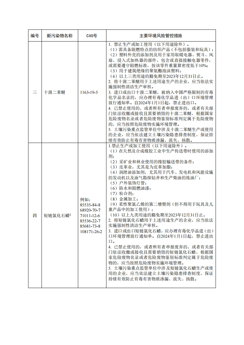 附件1陕西省重点管控新污染物清单(2023年版)(征求意见稿)编号新污染物名称CAS号主要环境风险管控措施1.禁止生产。2.禁止加工使用(以下用途除外)。(1)用于生产灭火泡沫药剂(该用途的豁免期至2023年12月31日止).例如:1763-23-13.将P℉OS类用于生产灭火泡沫药剂的企业,应当依法实全氟辛基磺酸及307-35-7施强制性清洁生产审核。其盐类和全氟辛2795-39-34.进口或出口P℉OS类,应办理有毒化学品进(出)口环境管理放行通知单。自2024年1月1日起,禁止进出口。基磺酰氟29457.72-5(PFOS类)29081-56-95.己禁止使用的,或者所有者申报废弃的,或者有关部70225-14-8门依法收缴或接收且需要销毁的P℉OS类,根据国家危险废物名录或者危险废物鉴别标准判定属于危险废物的,56773-42-3251099-16-8应当按照危险废物实施环境管理。6.土壤污染重点监管单位中涉及PFOS类生产或使用的企业,应当依法建立土壤污染隐患排查制度,保证持续有效防止有毒有害物质渗漏、流失、扬散。1.禁止新建全氟辛酸生产装置。2.禁止生产、加工使用(以下用途除外)。(1)半导体制造中的光刻或蚀刻工艺:(2)用于胶卷的摄影涂料:(3)保护工人免受危险液体造成的健康和安全风险影响的拒油拒水纺织品:(4)侵入性和可植入的医疗装置:(5)使用全氟碘辛烷生产全氟溴辛烷,用于药品生产目的:(6)为生产高性能耐腐蚀气体过滤膜、水过滤膜和医疗用布膜,工业废热交换器设备,以及能防止挥发性有机全氟辛酸及其盐化合物和PM25颗粒泄露的工业密封剂等产品而制造聚四氟乙烯(PTFE)和聚偏氟乙烯(PVDF):二类和相关化合物(PFOA类)(7)制造用于生产输电用高压电线电缆的聚全氟乙丙烯(FEP)3.将PFOA类用于上述用途生产的企业,应当依法实施强制性清洁生产审核。4.进口或出口PFOA类,被纳入中国严格限制的有毒化学品名录的,应办理有毒化学品进(出)口环境管理放行通知单。5.己禁止使用的,或者所有者申报废弃的,或者有关部门依法收缴或接收且需要销毁的P℉OA类,根据国家危险废物名录或者危险废物鉴别标准判定属于危险废物的,应当按照危险废物实施环境管理。6.土壤污染重点监管单位中涉及POA类生产或使用的企业,应当依法建立土壤污染隐患排查制度,保证持续有效防止有毒有害物质渗漏、流失、扬散。