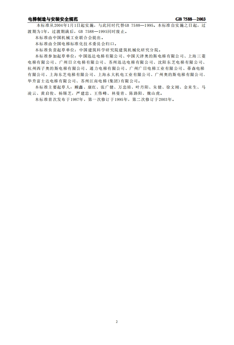 电梯制造与安装安全规范回GB7588—2003前言本标准的第1、2、3、4章以及7.2.1(部分内容)、8.17.1、9.1.2b)、9.9.6.2(部分内容)、12.6(部分内容)、13.1.1.3、15.2.3.2(部分内容),16.2a)6)(部分内容)、附录C、附录B、附录G、附录M及附录ZA为推荐性的,其余为强制性的。本标准是根据欧洲标准化委员会(CEN)的标准N81一1《电梯制造与安装安全规范》1998年版,对GB7588一1995《电梯制造与安装安全规范》(等效采用EN81一1:1985)进行修订的。经本次修订后的GB7588一2003在技术内容上与EN81一1:1998等效,条文编号与之一致。欧洲标准EN81一1:1998与EN81一1:1985相比,内容有较大变动。增加了许多新的技术内容和计算方法。本次对GB7588的修订除少部分内容根据我国电梯行业情况有所变更外,基本上接受了EN81一1:1998的内容。在本次修订中,主要技术内容变更如下:1.GB7588一1995适用范围简洁明确,因此仍保留GB7588一1995适用范围,为了明确起见,加上“病床电梯”,删去N81一1:1998的使用范围。2.本次修订对N81一1:1998所引用的标准做了以下转化:(1)属于EN81一1:1998“引用标准”一章中列入的国际标准或国外先进国家标准已被我国等效采用后成为我国国家标准或行业标准的,则直接引用相应的我国标准号。(2)属于EN81一1:1998“引用标准”一章中没有列入的,在EN81一1:1998中也未提及标准代号,但其内容上涉及我国应实施的有关标准的,则也列入“引用标准”。如:16.2)6)中原文为“使用CENELEC符号”,列入对应的我国标准GB/T4728《电气图用图形符号》。又如:对于9.1.2c)的要求,列入对应的我因标准GB8903《电梯用钢丝绳》。(3)属于EN81一1:1998“引用标准”一章中已列入的,但我国尚未转化的国外先进标准,我们直接引用国外标准号,如:EN12015《电磁兼容性用于电梯、自动扶梯和自动人行道的系列标准辐射》,EN12016《电磁兼容性用于电梯、自动扶梯和自动人行道的系列标准抗干扰性》。3.为了与我因其他电梯标准协调,EN81一1:1998中与GB/T7024《电梯、自动扶梯和自动人行道术语》相同的术语不再列入,仅保留专用术语,并增加了“检修活板门”及“井道安全门”等。4.根据我国国情,对N81一1:1998的部分内容进行了修改或调整。(1)增加的内容:如在5.1.2中增加“观光电梯可除外”:在7.1及8.6.3中增加了“对于载货电梯,此间隙不得大于8mm”:在5.6.1中增加“特殊情况,为了满足底坑安装的电梯部件的位置要求,允许在该隔障上开尽量小的缺口”。(2)删去的内容:如删去9.8.2.1中“具有缓冲作用的瞬时式安全钳”及其他条文中相关内容:删去10.3.4中“具有缓冲复位的蓄能型缓冲器”及其他条文中相关内容。(3)调整的内容:如对8.2.1、8.2.2轿厢有效面积的规定进行了调整:对9.8.2.1中轿厢采用的瞬时式和新进式安全钳的速度范围作了调整:在附录D的D2j)中,将:“额定速度”调整为“检修速度’:将F5.3.1“具有缓冲作用的蓄能型缓冲器”的试验方法内容调整为“线性蓄能型缓冲器”试验方法。本标准规定的各项安全准则以及附录内所有的要求,为乘客电梯、载货电梯的制造、安装与检验提供了全国统一的技术依据和安全要求,对于电梯交付使用前的检验、定期检验以及重大改装或事故后的检验的内容不应超出本标准的范围。本标准的附录A、B、D、F、H、J、K、L、N均为标准的附录,附录C、E、G、M、ZA为提示的附录。
