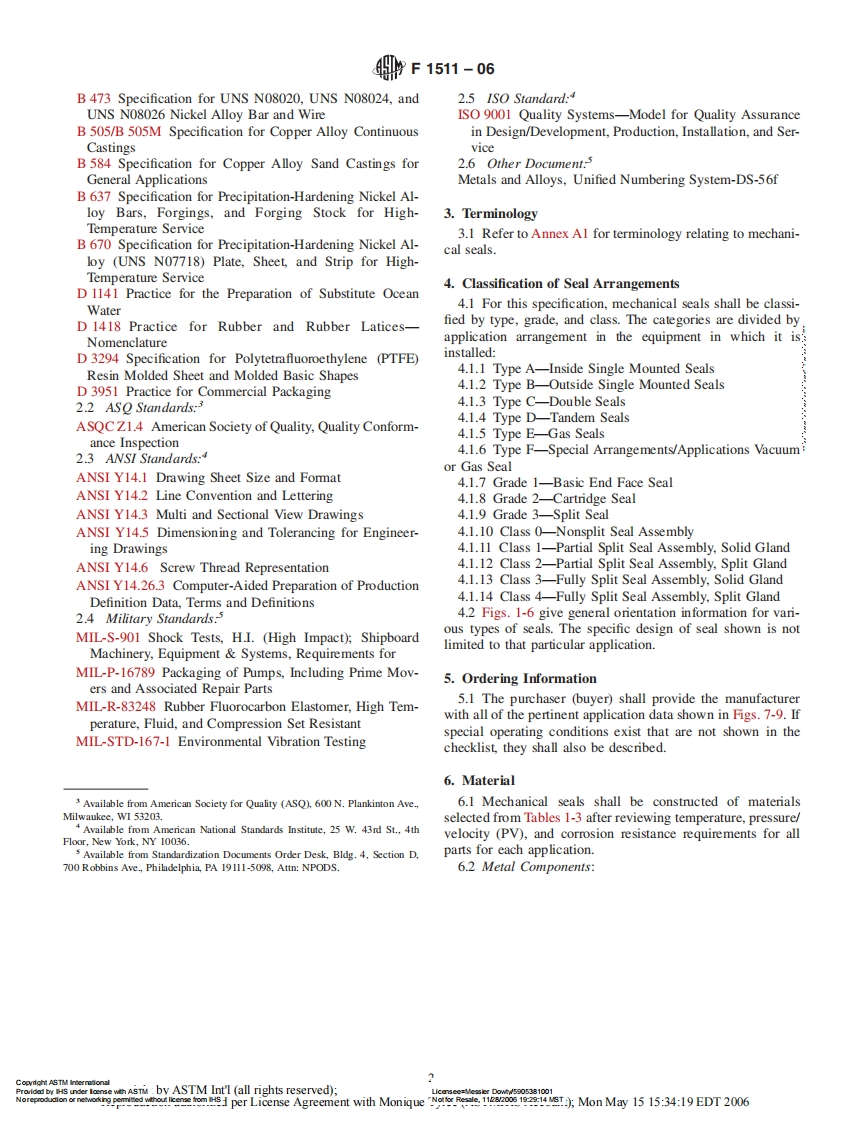 Designation:F 1511-06An American National StandardNTERNATIONALStandard Specification forMechanical Seals for Shipboard Pump Applications1This standard is issued under the fixed designation F 1511:the number immediately following the designation indicates the year oforiginal adoption or,in the case of revision,the year of last revision.A number in parentheses indicates the year of last reapproval.Asuperscript epsilon (e)indicates an editorial change since the last revision or reapproval.1.ScopeA 579/A 579M Specification for Superstrength Alloy Steel1.1 This specification covers mechanical end-face seals forForgingscentrifugal and positive displacement pumps for shipboard use.A 693 Specification for Precipitation-Hardening Stainless1.2 The following types of seals are not included in thisand Heat-Resisting Steel Plate,Sheet,and Stripspecification:lip seals,oil seals,circumferential seals,orA 744/A 744M Specification for Castings,Iron-Chromium-labyrinth seals.Nickel,Corrosion Resistant,for Severe Service1.3 The values stated in inch-pound units are to be regardedB 62 Specification for Composition Bronze or Ounce Metalas standard.The values given in parentheses are mathematicalCastingsconversions to SI units that are provided for information onlyB 127 Specification for Nickel-Copper Alloy (UNSand are not considered standard.A companion hard metricN04400)Plate,Sheet,and Stripstandard is in the process of preparation.B 164 Specification for Nickel-Copper Alloy Rod,Bar,and1.4 Special requirements for U.S.Navy Shipboard PumpWireApplications are included in Supplement S1.B 166 Specification for Nickel-Chromium-Iron Alloys(UNSN06600,N06601,N06603,N06690,N06693,2.Referenced DocumentsN06025.and N06045)*and Nickel-Chromium-Cobalt-2.1 ASTM Standards:2Molybdenum Alloy (UNS N06617)Rod,Bar,and WireA 108 Specification for Steel Bar.Carbon and Alloy.Cold-B 168 Specification Nickel-Chromium-Iron Alloys (UNSFinishedN06600.N06601,N06603,N06690.N06693,N06025A 182/A 182M Specification for Forged or Rolled Alloyand N06045)and Nickel-Chromium-Cobalt-Molybdenumand Stainless Steel Pipe Flanges,Forged Fittings,andAlloy (UNS N06617)Plate,Sheet,and StripValves and Parts for High-Temperature ServiceB 271 Specification for Copper-Base Alloy CentrifugalA 240/A 240M Specification for ChromiumandCastingsChromium-Nickel Stainless Steel Plate,Sheet,and StripB 333 Specification for Nickel-Molybdenum Alloy Plate,for Pressure Vessels and for General ApplicationsSheet,and StripA 276 Specification for Stainless Steel Bars and ShapesB 335 Specification for Nickel-Molybdenum Alloy RodA 313/A 313M Specification for Stainless Steel SpringB 338 Specification for Seamless and Welded Titanium andWireTitanium Alloy Tubes for Condensers and Heat Exchang-A 351/A 351M Specification for Castings,Austenitic,forersPressure-Containing PartsB 348 Specification for Titanium and Titanium Alloy BarsA 436 Specification for Austenitic Gray Iron Castingsand BilletsA 494/A 494M Specification for Castings,Nickel