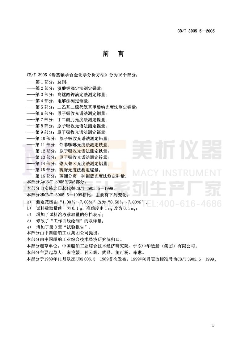 10s77120.60U05备案号:16165-2005中华人民共和国船舶行业标准CB/T3905.5-2005代替CB/T3905.5-1999锡基轴承合金化学分析方法第5部分:二乙基二硫代氨基甲酸钠光度法测定铜量CY INSTRUMENTMethod for chemical analysis of tin-base bearing alloy-Part 5:Sodium diethyldithiocarbamate photometric methodfor the determination of copper content2005-04-11发布2005-07-01实施国防科学技术工业委员会发布