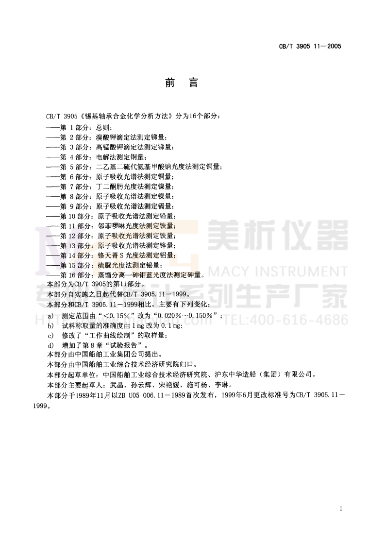 1CS7712060U05备案号:16171-2005中华人民共和国船舶行业标准CB/T3905.11—2005代替CB/T3905.11-1999锡基轴承合金化学分析方法口第11部分:邻菲罗啉光度法测定铁量RUMENTMethod for chemical analysis of tin-base bearing alloyPart 11:0-Phenanthroline photometric method forthe determination of iron contentHTTP://www.macylab.com TEL:400-616-46862005-04-11发布2005-07一01实施国防科学技术工业委员会发布