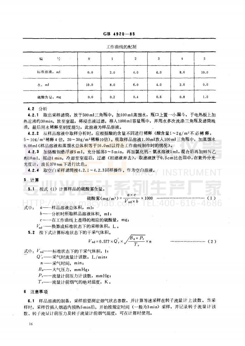 中华人民共和国国家标准UDC628.512硫酸浓缩尾气硫酸雾的测定:661.25:543.432铬酸钡比色法GB4920-85Determination of sulphuric acid mistin tail gas in sulphuric acid concentrationprocess-Barium chromate colorimetric method本标准适用于火炸药厂疏酸浓缩尾气中硫酸雾的分析,测试范围100~30000mg/m3。1原理硫酸根离子与铬酸钡作用,产生黄色铬酸根离子,根据黄色深浅比色测定。2仪器除一般通用化学分析仪器外应具备:2.1无硫酸根离子的玻璃纤维滤筒。2.2烟尘测试仪:YC-1型。美析仪器2.2分光光度计。3试剂MACY INSTRUMENT本标准所使用的试剂,除指明者外,均为分析纯。3.1铬酸钡酸性悬浊液:称25g铬酸钡(优级纯)与100ml1N乙酶及100m10.02N盐酸混合,振摇均匀即为悬浊液。3.2氯化钙-氨水溶液:称取1.85克氯化钙,溶于500m6N氨水中(防止二氧化碳溶人)。3.3疏酸标准溶液:准确称取1.777g疏酸钾(优级纯,800℃下恒重)溶于水中,稀释至1L。此溶液1ml相当于1.0mg硫酸。分析时用水稀释10倍成1ml相当于0.1mg疏酸的标准溶液。4操作4.1工作曲线的绘制取疏酸标准溶液,如表1配制成不同浓度的溶液,按4.2.3分析操作方法,在紫外分光光度计上,波长370nm处,用0.5cm比色皿测吸光度(A),以吸光度(A)为纵坐标,以硫酸含量(mg)数为横坐标,做工作曲线。国家环境保护局1985-01-18发布1985-08-01实施15