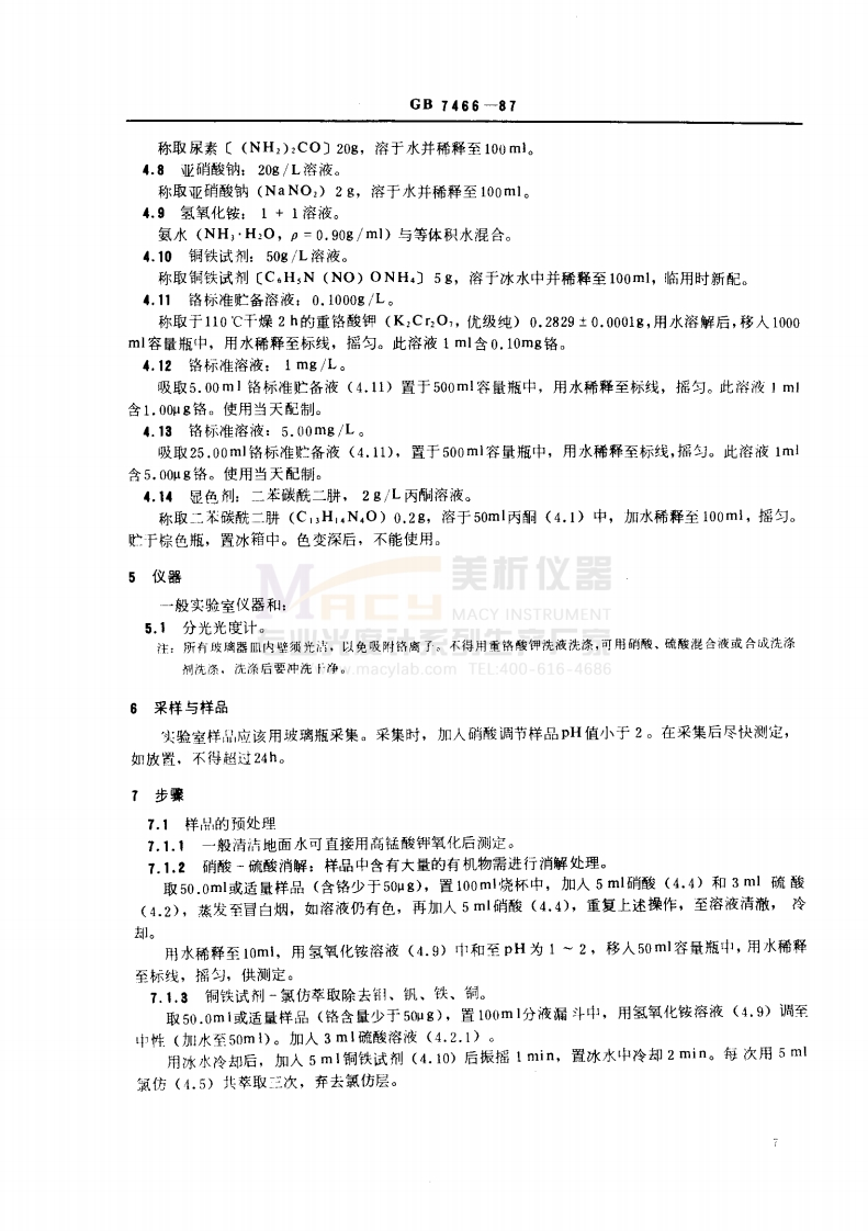 中华人民共和国国家标准UDC614.777:546.76水质总铬的测定GB7466一87Water quallty-Determination of total chromium1定义总铬的测定是将三价铬氧化成六价铬后,用二苯碳酰肼分光光度法测定。当铬含量高时(大于1mg/L),也可采用疏酸亚铁铵滴定法。第一篇高锰酸钾氧化一二苯碳酰二肼分光光度法2适用范围2.1本标准适用于地面水和工业废水中总铬的测定。2.2测定范围试份体积为50ml,使用光程长为30mm的比色皿,本方法的最小检出量为0.2μg铬,最低检出浓度为0.004mg/L,使用光程为10mm的比色皿,测定上限浓度为1.0mg/L。2.3干扰铁含量大于1mg儿显黄色,六价钼和汞也和显色剂反应,生成有色化合物,但在本方法的显色酸度下,反应不灵做,钼和汞的浓度达200mgL不扰测定。钒有干扰,其含量高于4mg/L时即F扰显色。但锐与显色剂反应后10min,可自行馒色。列生产厂家3原理HTTP://www.macylab.com TEL:400-616-4686在酸性溶液中,试样的三价铬被高锰酸钾氧化成六价铬。六价铬与二苯碳酰二肼反应生成紫红色化合物,于被长540nm处进行分光光度测定。过量的高锰酸钾用亚硝酸钠分解,而过量的亚硝酸钠又被尿素分解。4试剂测定过程中,除非另有说明,均使用符合同家标准或专业标准的分析纯试剂和蒸馏水或同等纯度的水,所有试剂应不含铬。4.1丙酮(C,H。0)。4.2硫酸4.2.11+1疏酸溶液。将硫酸(HS04,p=1.84g/ml,优级纯)缓缓加入到同体积的水中,混匀。4.3磷酸:1+1溶液。将磷酸(H,P04,p=1.69g/ml)与水等体积混合。4.4硝酸(HN0,p=1.42g/ml)。4.5氯仿(CHC1)。4.6高锰酸钾:40g/L溶液。称取高锰酸钾(KMnO,)4g,在加热和搅拌下溶于水,最后稀释至100ml。4.7尿素:200g/L溶液。国家环境保护局1987-03-14批准1987-08-01实施6
